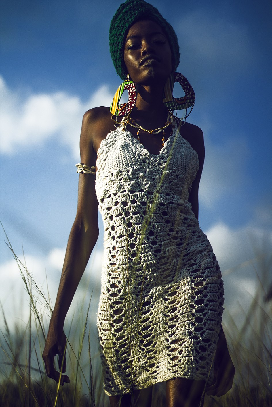 Vestido e turbante Elizete Karg, colar acervo, brinco e bracelete Quixotesca.
