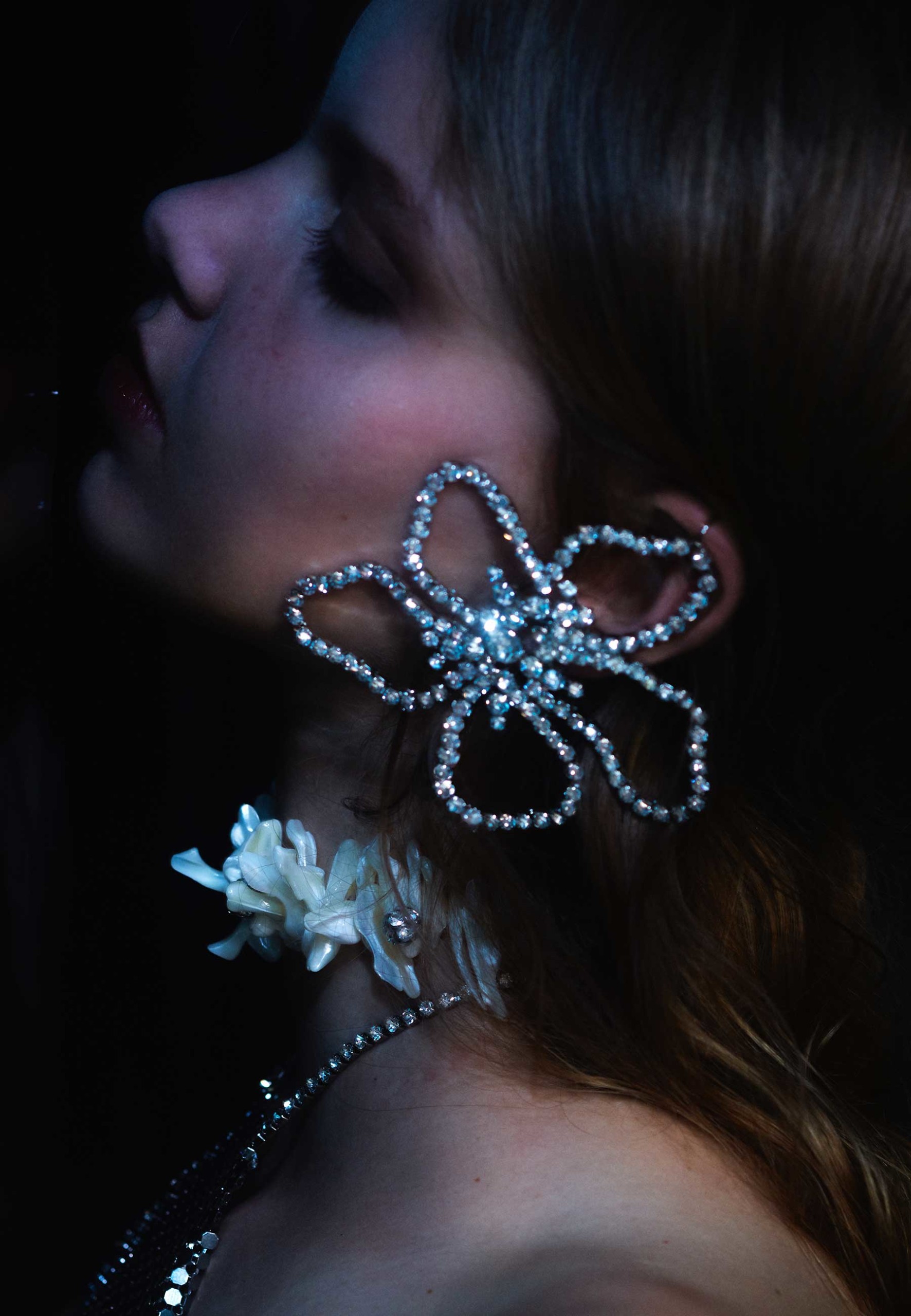 Para a sua coleção de verão 2022, Eduardo Caires aposta pela primeira vez em formas orgânicas em suas peças, como nos brincos e tops em forma de hibisco e nos colares cascata, que fazem curvas antes inimagináveis com fios de strass, seu material de trabalho mais importante. “Quis levar o strass para o 3D, tirando-o do seu lugar usual de franja”, explica. Com um estudo de arames, conseguiu tirar a ideia do papel e criar este volume.