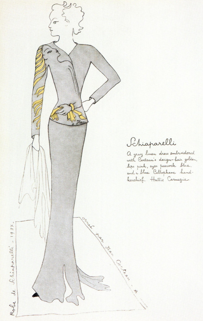 Christian Bérard também se destacou entre os ilustradores de Elsa para o título e, mesmo depois de deixá-lo em 1935, continuou enviando seus rascunhos em segredo sob o pseudônimo ‘Sam’. De todos, porém, o “triângulo amoroso” entre Elsa Schiaparelli, a Harper’s Bazaar e Jean Cocteau talvez tenha sido o mais prolífico. Multidisciplinar, o francês desenhou visuais celebrados da estilista em 1937 (como um conjunto cinza bordado pelo ateliê Lesage, em julho) e escreveu sobre seu trabalho na mesma edição: “Schiaparelli é, acima de tudo, uma modista de excentricidade. (…) Seu endereço na Place Vendôme é como o laboratório do diabo. Mulheres vão até lá e caem em uma armadilha, saindo mascaradas, disfarçadas, deformadas, reformadas, de acordo com as vontades de Elsa.” Anos mais tarde, a designer criou os figurinos para a peça “Os Monstros Sagrados” de Cocteau, fotografados por Man Ray na atriz Jany Holt e publicados na edição de abril/1940 de Bazaar.