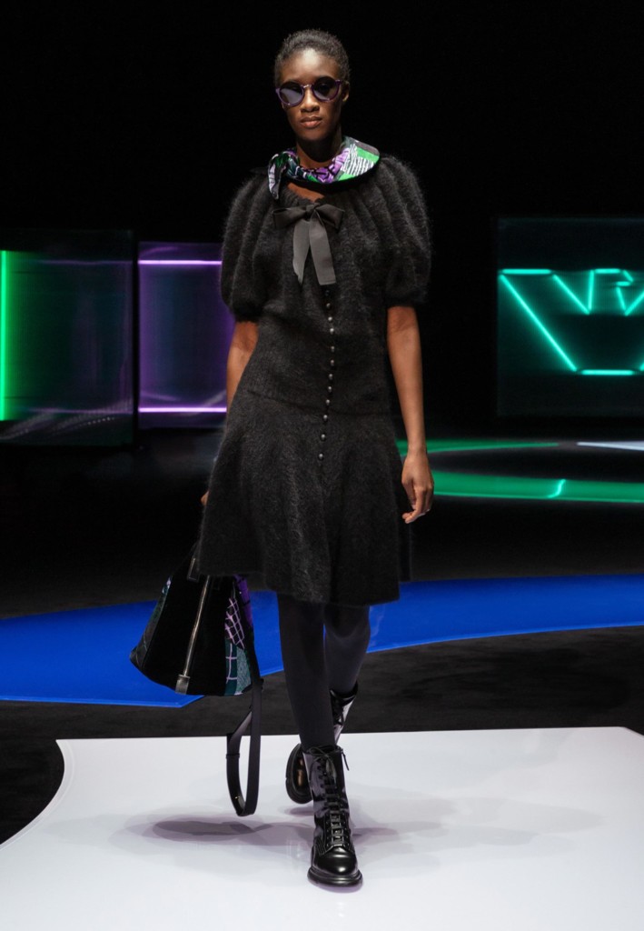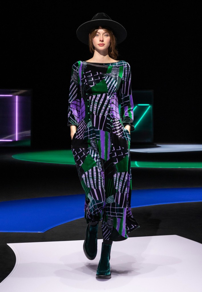 O clima noturno da coleção predominantemente preta e cinza ganha vibrância com splashs néon que pintam desde os básicos do closet – como camisetas de golas altas – até luvas e também às maxibijoux de resina. Xadrezes, tweed, tricôs, bordados e patchworks conferem textura e brilhos a essa silhueta comfy da coleção que é amarrada no styling por sapatos fechados e sem salto que ressurgem já despertando desejo!