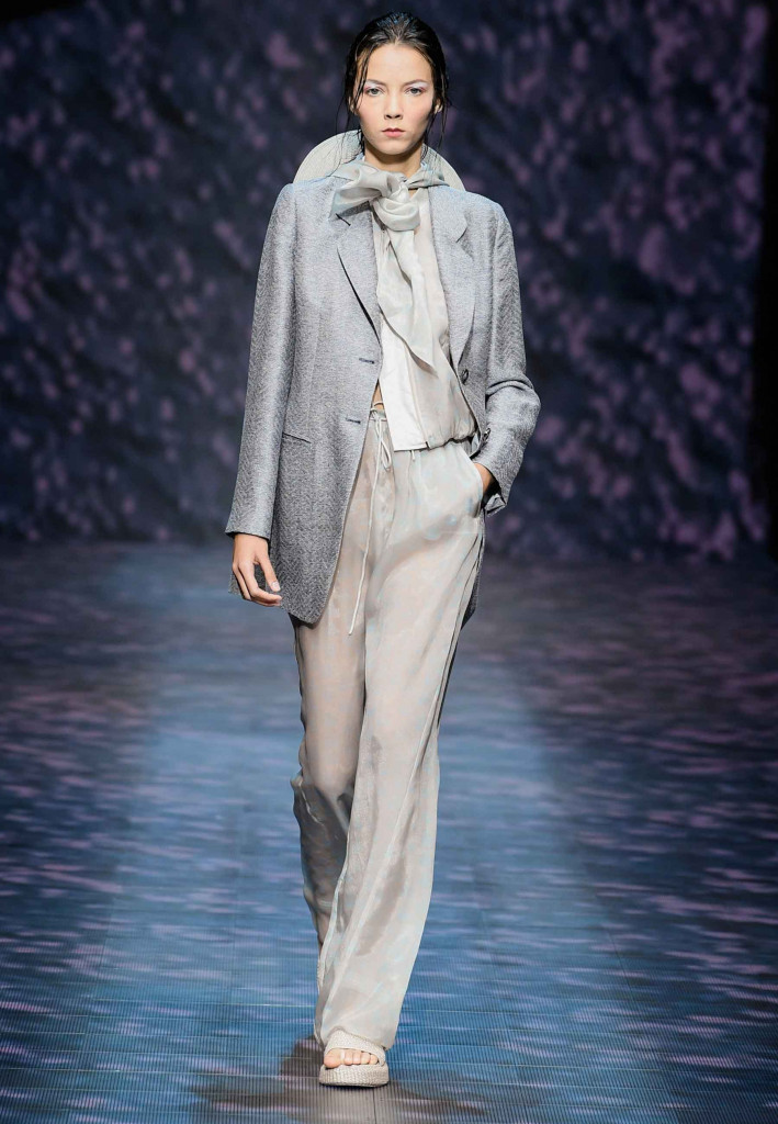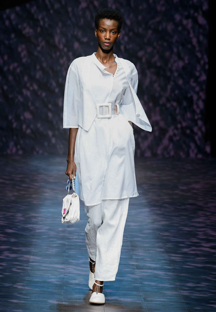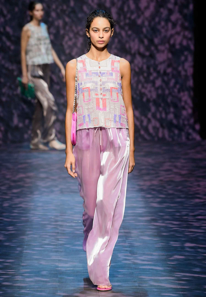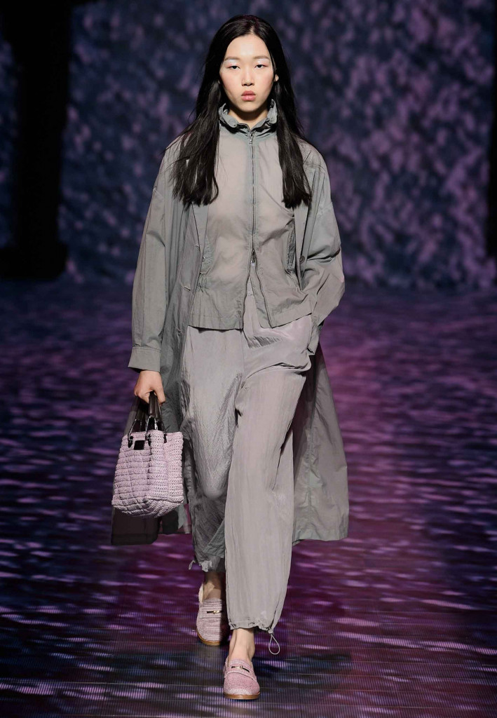 Impossível não lembrar da estrofe de Paulinho da Viola – “foi como um rio que passou em minha vida” – ao assistirmos a coleção verão 2023 da Emporio Armani, que nos convida a viajar por águas calmas que são traduzidas na escolha dos leves tecidos e acabamentos holográficos.