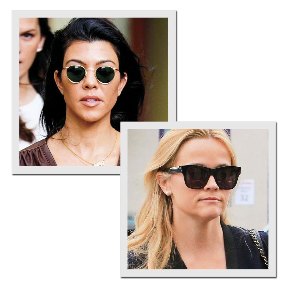 Quem tem rosto em formato de coração, com a atriz Reese Witherspoon e a estrela de reality show Kourtney Kardashian, pode apostar nos aros quadrados, que ajudam a diminuir a parte superior do rosto. Os óculos redondos também são ótimos para ressaltar as maçãs da face.