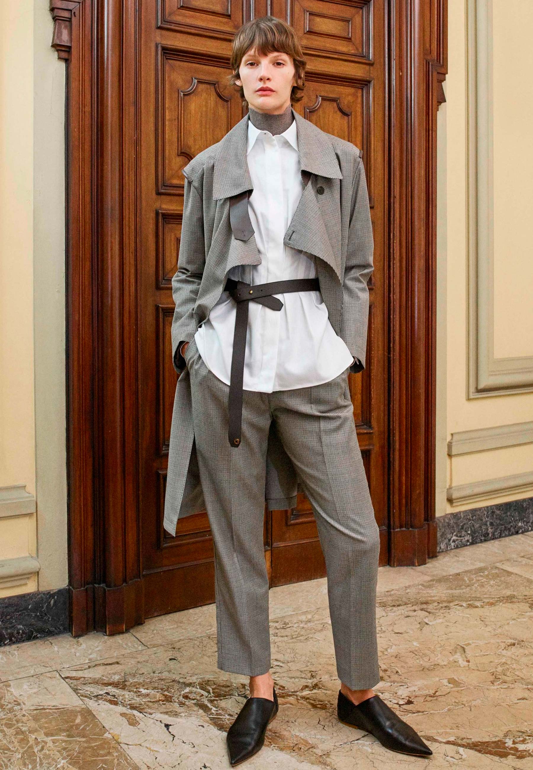 O terno de lã cinza da Agnona é elegante até dizer chega. Repare no truque de styling com a camisa branca usada por fora da calça, e marcada por um cinto de couro que se fecha em laço.