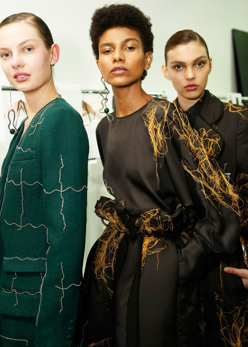 Pregas e plissados, também vistos de dentro, decoram a assimetria de saias, calças e trench coats estruturados. Enquanto isso, a leveza surge em parkas transparentes – e cobertas por linhas felpudas e bordados metálicos, que trazem descontinuidade nas linhas finas.