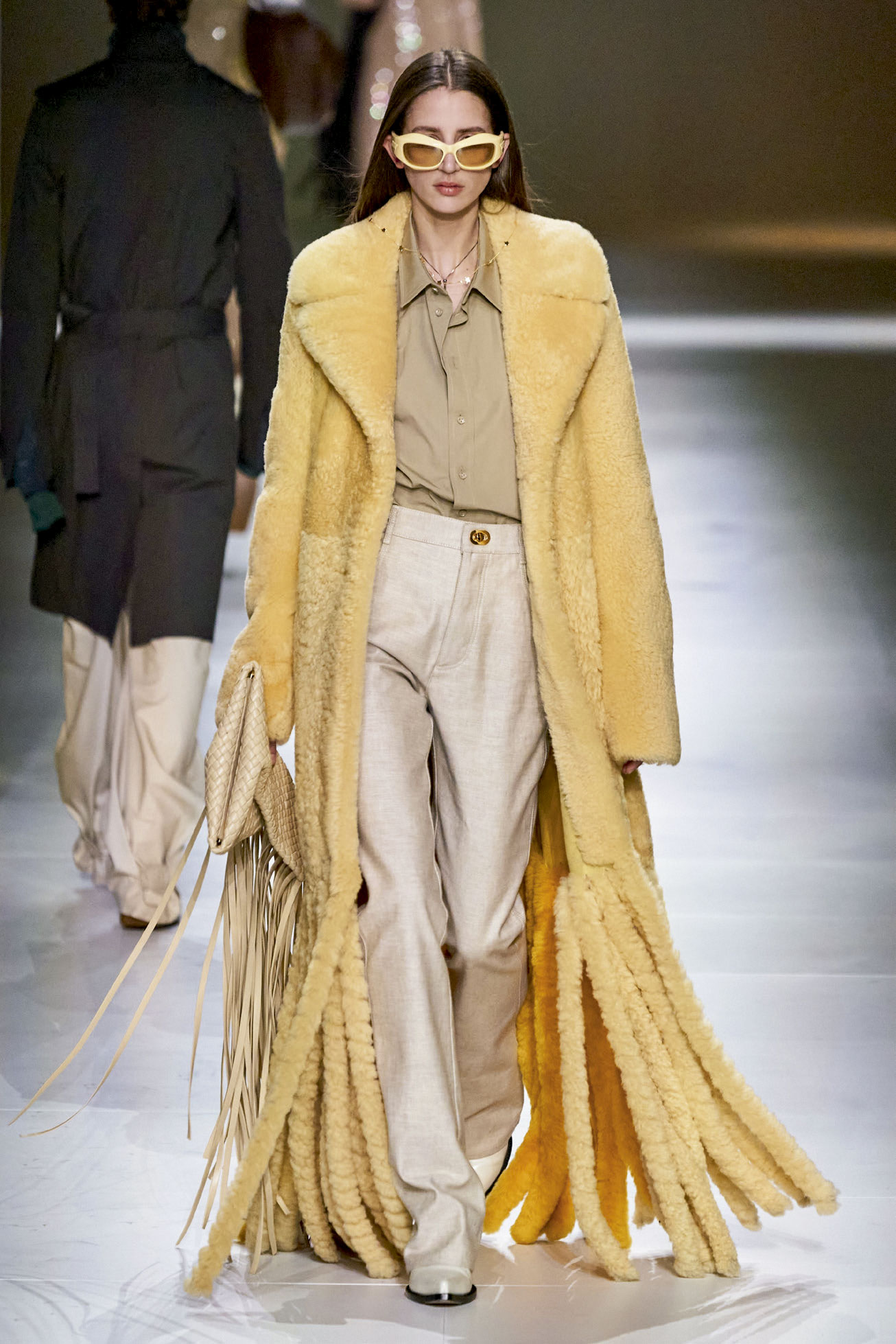 Mas nada como o casaco de lã ultramacia com franjas expressivas no mesmo material que Daniel Lee emplacou para o próximo inverno da Bottega Veneta. Conforto, aliás, foi uma das preocupações da coleção, com fios stretch dando o tom em boa parte das peças.