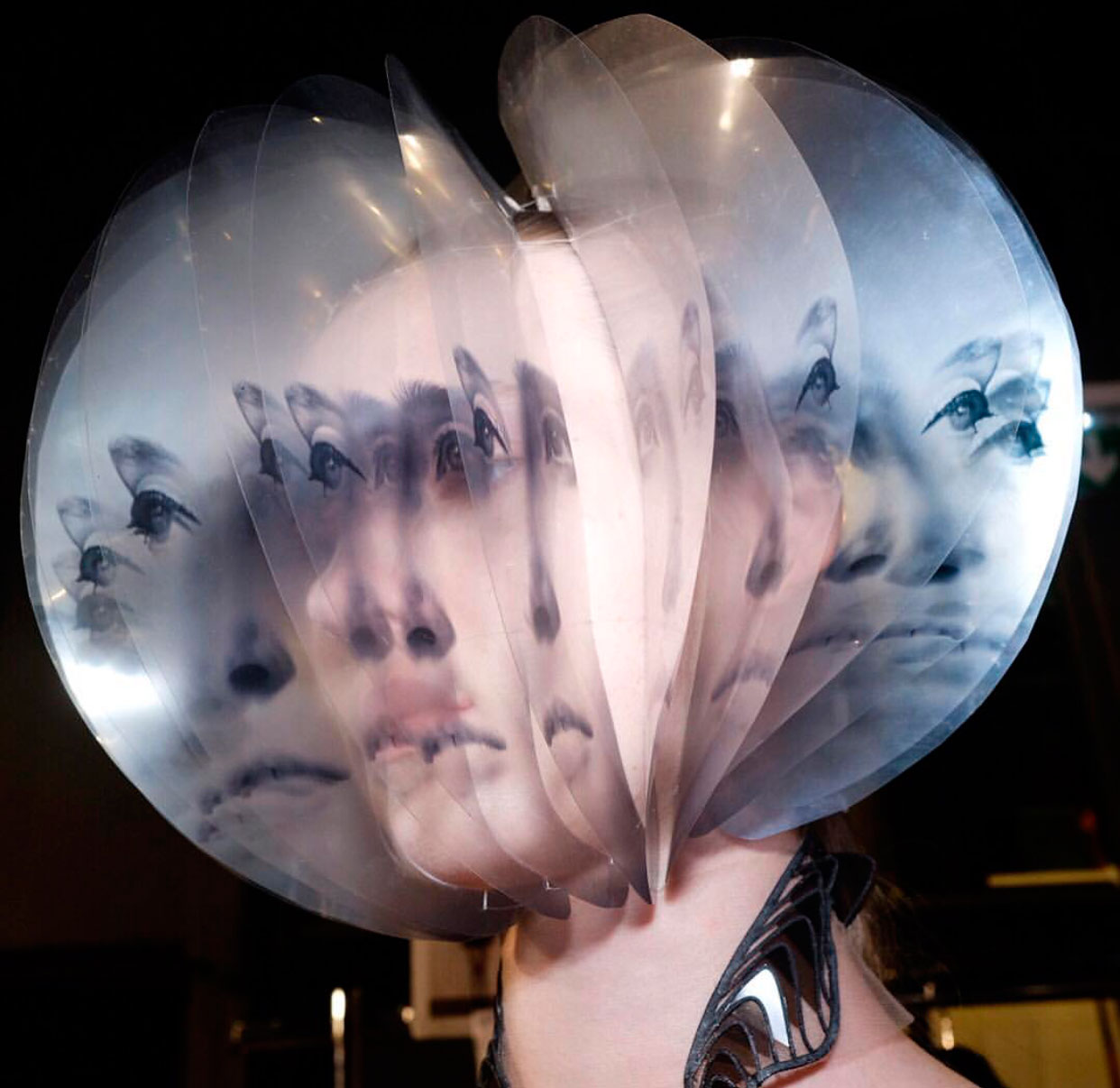 Trata-se de um acessório de cabeça feito de espelhos que, quando usado, multiplica o rosto e cria um visual bem alienígena. Veja o detalhe acima!