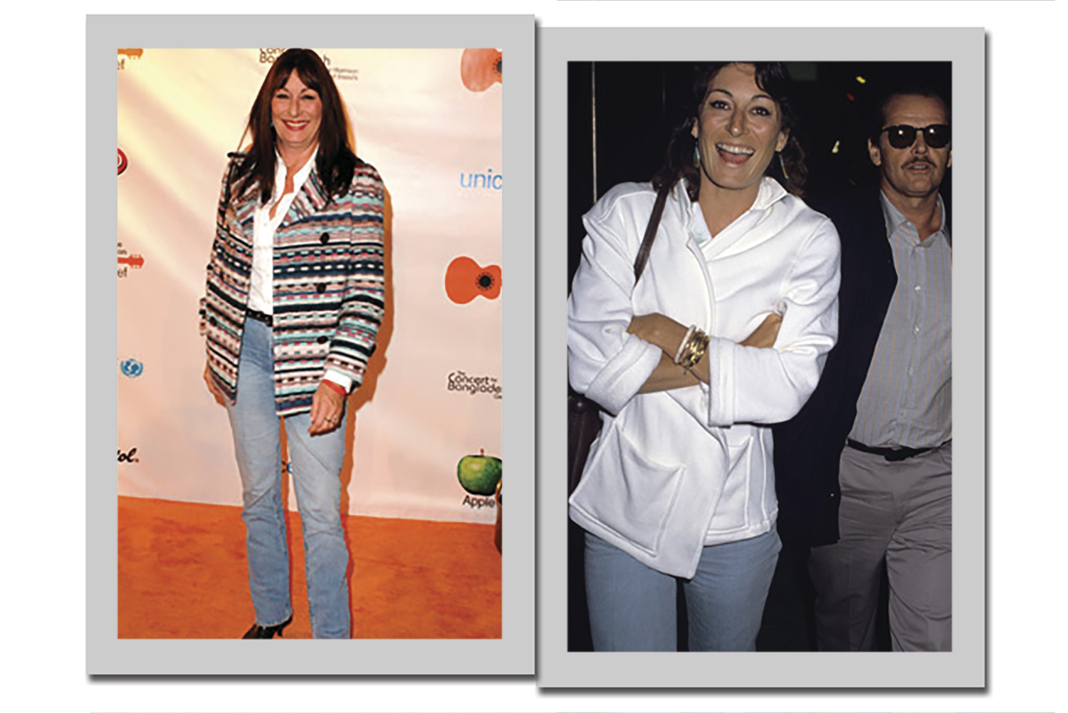 Como se tivesse inventado o mood all white, Anjelica Huston carregava com maestria o visual. De blazer e saia, camisa ou até vestido com trench coat, o segredo é o batom vermelho. Seu cabelo preto – quase uma marca registrada – se destaca na cor clara, arrematando o visual.