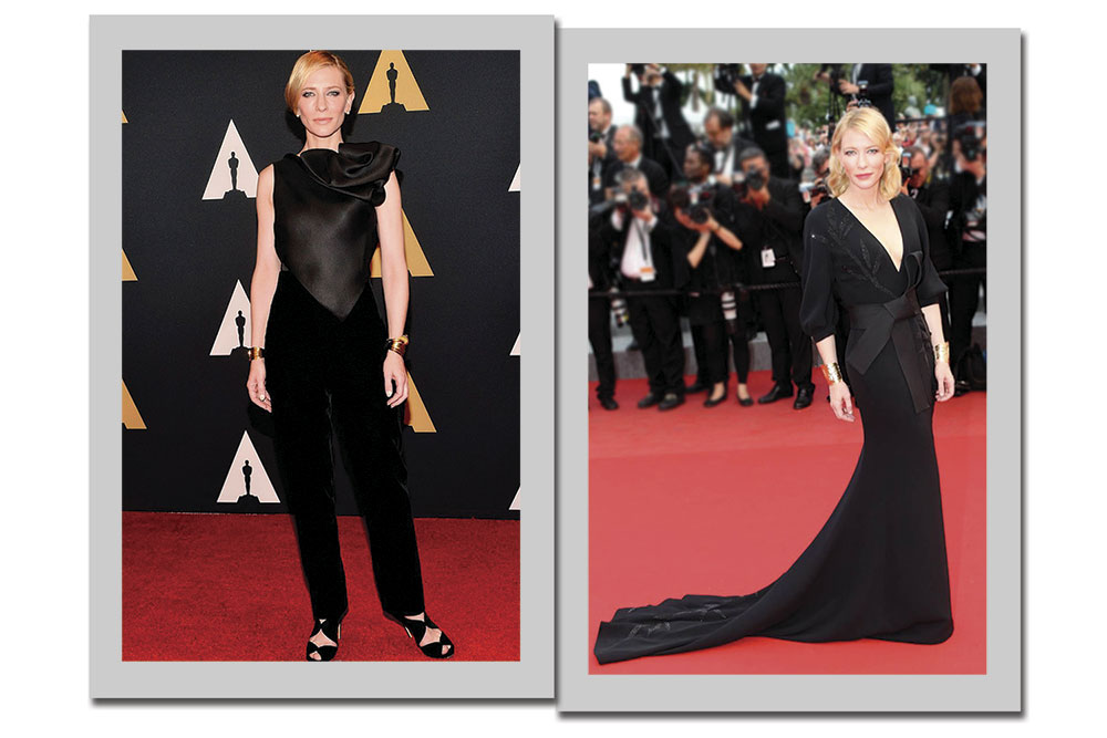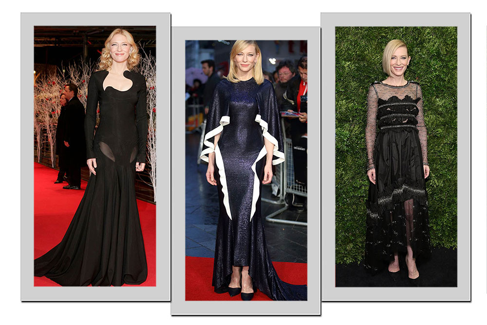 E é claro, com sua finesse, Cate Blanchett não poderia esquecer do preto ou do azul-marinho. Certeiro em qualquer situação, a cor escura impacta quando apresentada em modelos com recortes modernos, transparência ou com debrum branco.