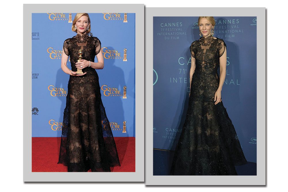 Para completar a elegância do estilo da atriz, ela provou que repetir roupa é chic sim. Ela usou um vestido preto de renda Armani Privé em 2014 no Globo de Ouro, e repetiu o modelo este ano, para o Festival de Cannes.
