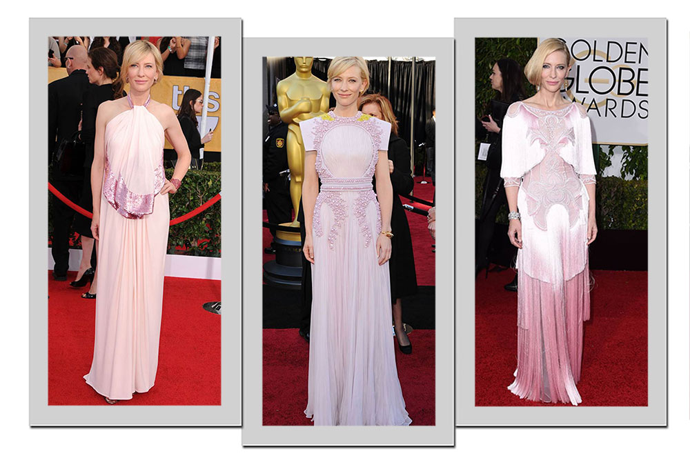 Cate Blanchett abusa da cor rosa pastel no red carpet. E para não cair na mesmice, a atriz opta por modelos bordados, ou com cortes modernos.
