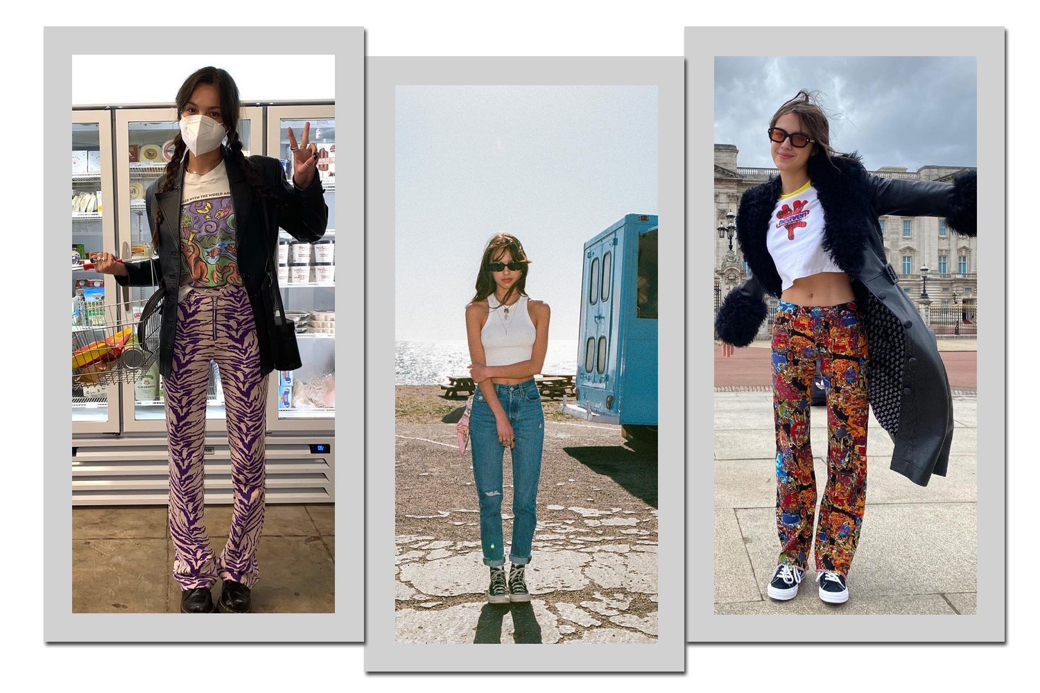 As cores são um elemento chave no estilo da artista, que brinca com tons diferentes em um mesmo look ou, até mesmo, mix de nuances de uma mesma tonalidade. As estampas ajudam Olivia Rodrigo a acrescentar ainda mais vivacidade aos visuais, estando presentes tanto em camisetas, quanto em calças e outras peças.