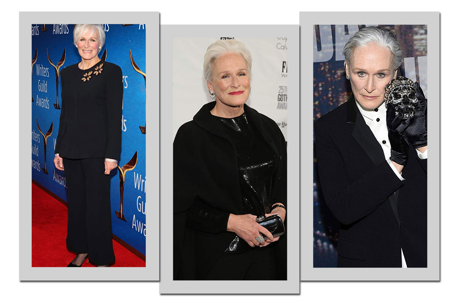 Para o red carpet, Glenn Close sabe o que fazer: o que importa é carregar o look. O modelo prateado possui gola fechado, mangas compridas e saia longa. Mas o que garante estilo é a pose da atriz. O modelo ouro velho em tafetá possui decote tomara que caia e modelagem da saia com camadas. E o modelo preto com o centro azul foi arrematado com óculos escuros.