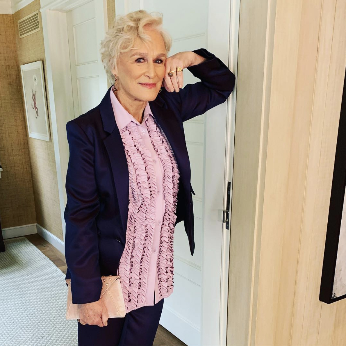 Glenn Close usa o estilo all black de maneira clássica. O conjunto blusa de mangas compridas e calça ganhou broches em motivos florais para arrematar o visual. O batom levemente vermelho fechou o look de casaco de lã preto e não há nada mais clássico do que o terno.