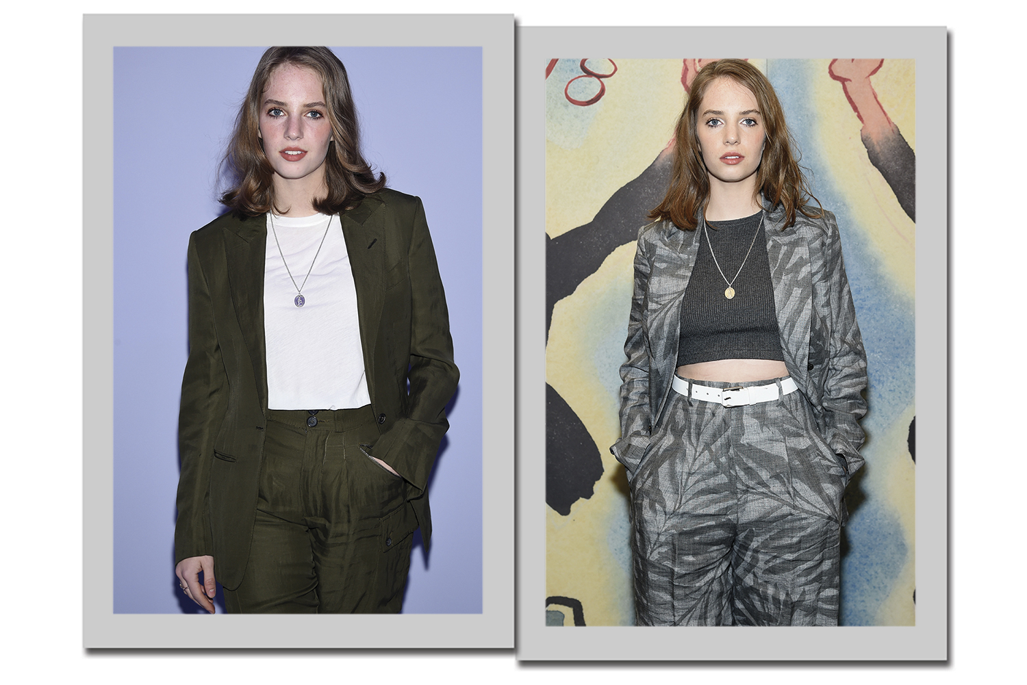 Blazer e calça no melhor estilo dos anos 1990. Por clara influência dos pais, que foram ícones na época, camisetas bem casuais arrematas os looks. A peças – blazer e calça – possuem a modelagem solta, sem moldar ou aumentar o corpo. Despojada, Maya prefere – nessas ocasiões – apostar no make leve.
