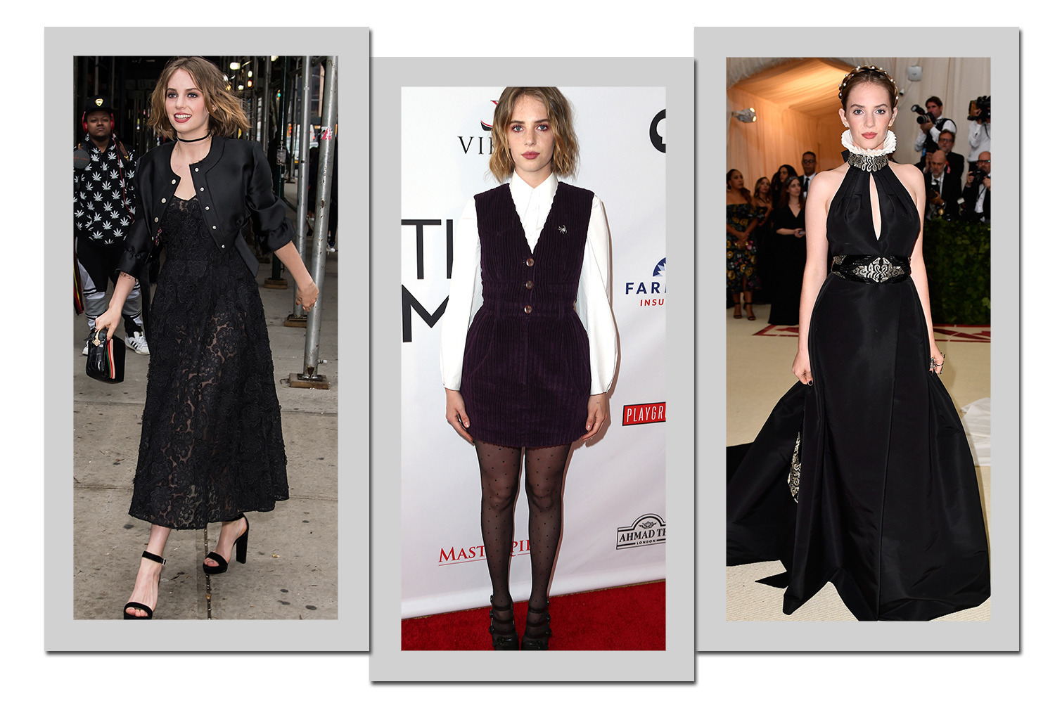 Gótica suave é o melhor mood da atriz. No all black, ela garante finesse e usa alguns pontos do estilo gótico para montar seu visual. Por exemplo, a gargantilha preta – também usada nos 1990 – e o salto quadrado são itens da cultura gótica. O vestidinho por cima da camisa preta e o longo usado no red carpet não precisam nem de descrição. Bazaar ama esse lado de Maya Hawke!