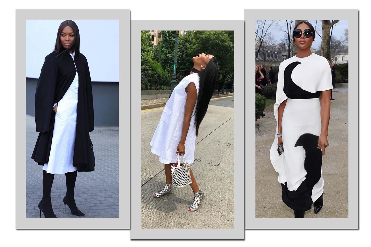 O preto e branco é um clássico, e Naomi sabe como usar. Apostando no básico ou nos grafismos, a modelo garante elegância.