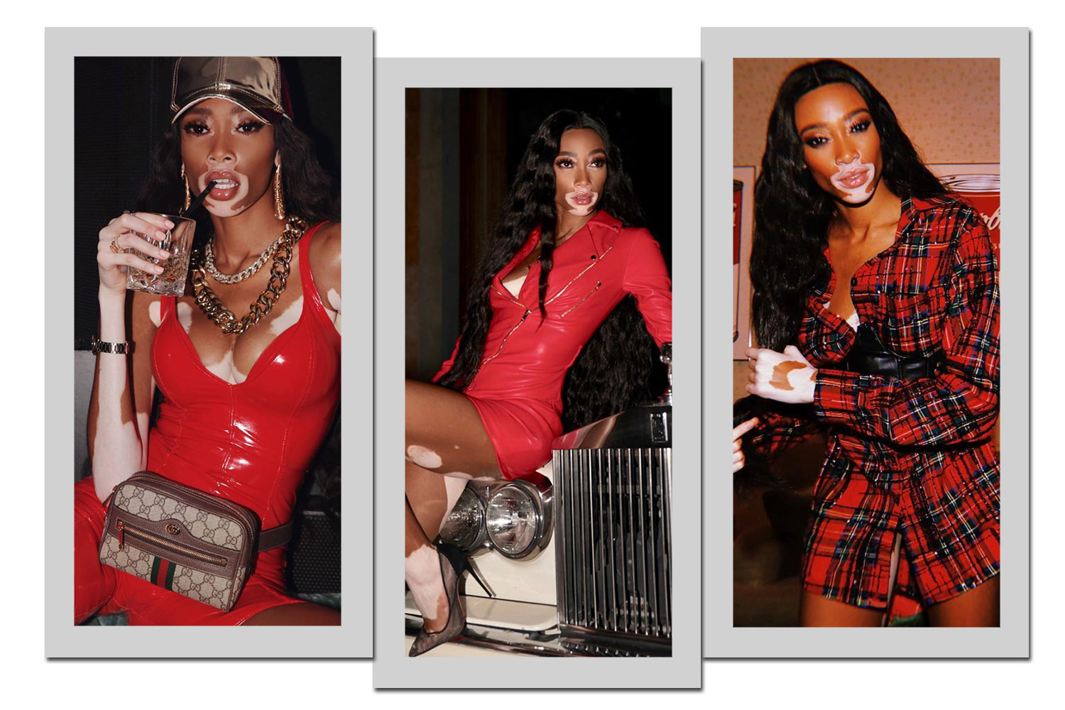 Winnie Harlow ama vermelho! Enriquecer a roupa com acessórios é a dica da modelo.