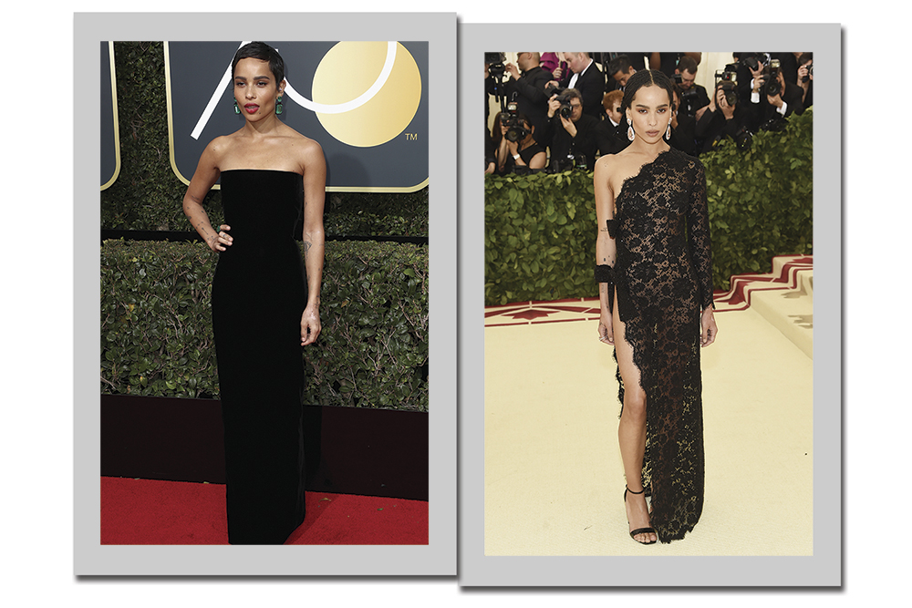 Como toda fashionista, Zoë Kravitz abusa do all black. Um clássico e sinônimo de finesse, a atriz abusa da cor no red carpet. O tomara que caia preto, com corte reto, é simples, mas a modelagem impecável enriquece o vestido e os brincos de esmeralda arrematam o look. Já a renda preta romantiza o visual, e a fenda equilibra, dando sensualidade ao look.