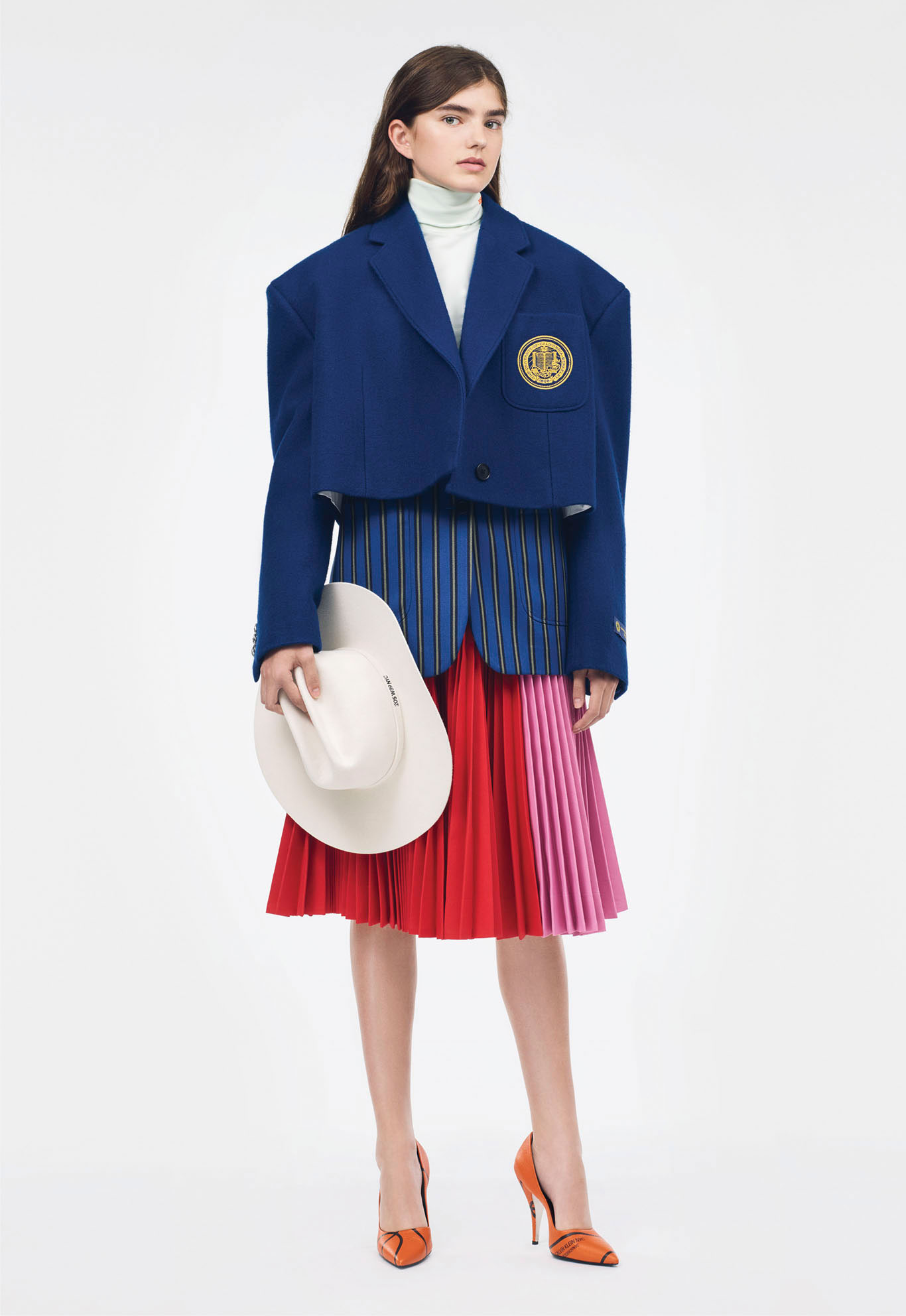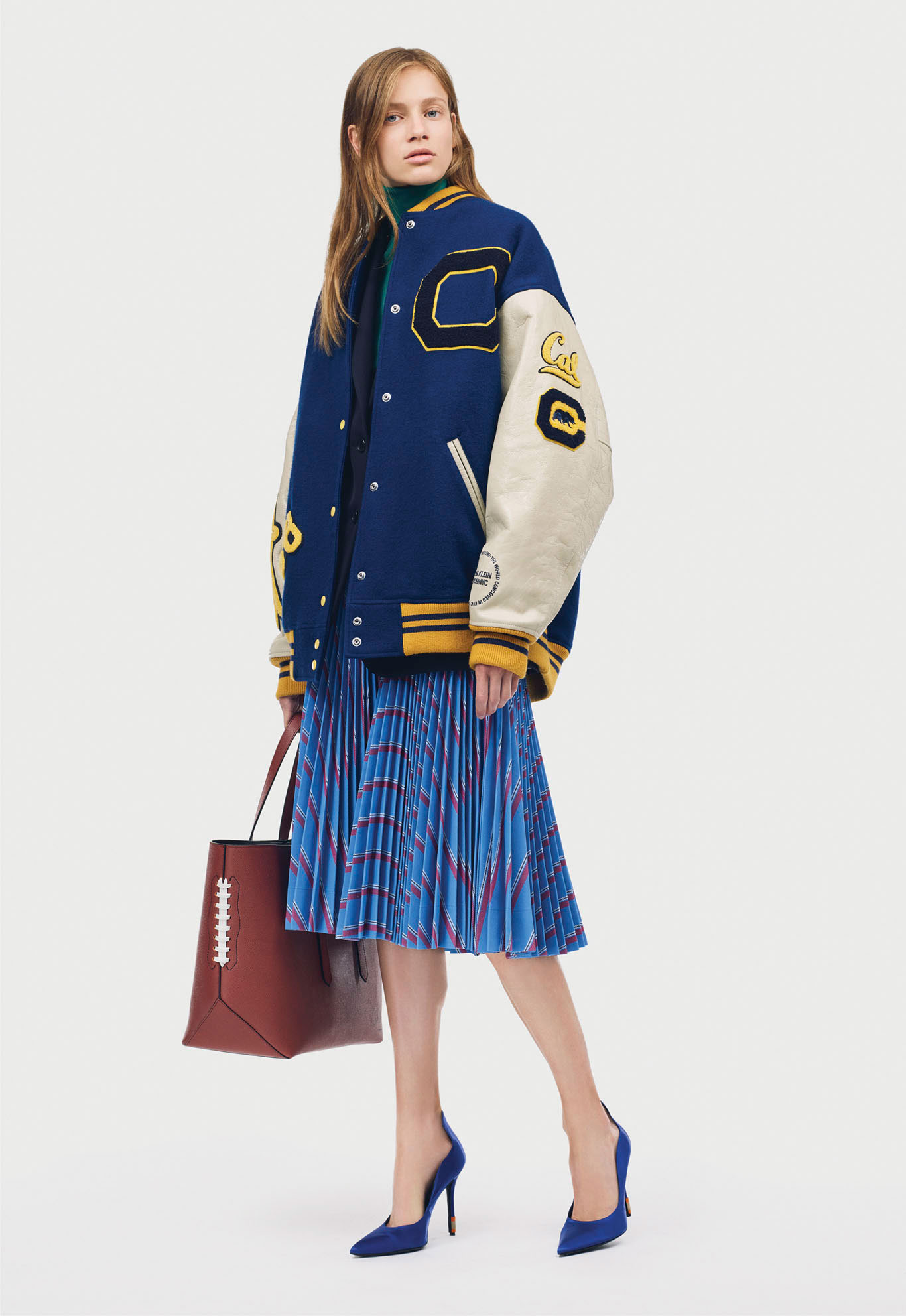 A pegada da linha é esportiva, fiel ao DNA da label, com forte inspiração no futebol americano, que aparece nos ombros marcados, nas bombers oversized e nos escarpins com prints de bola.
