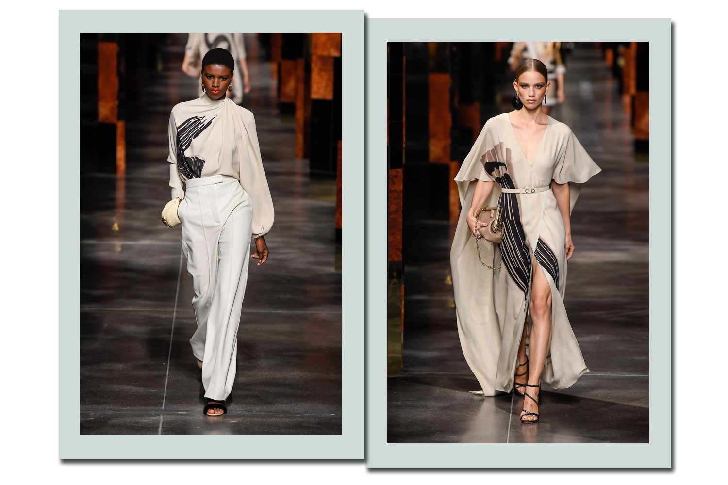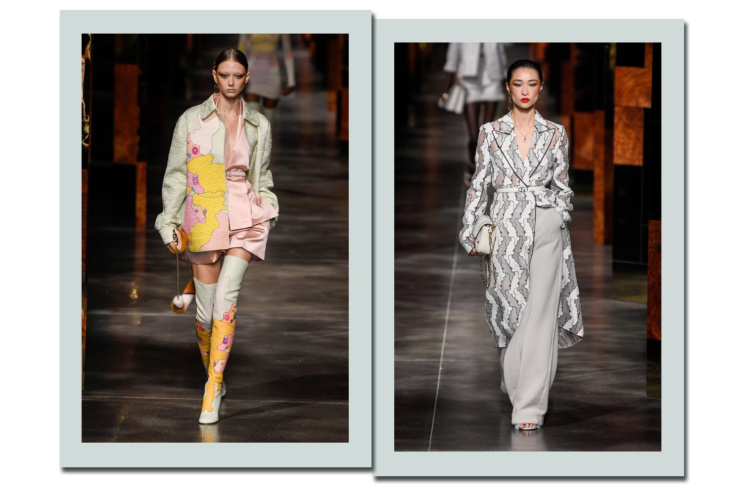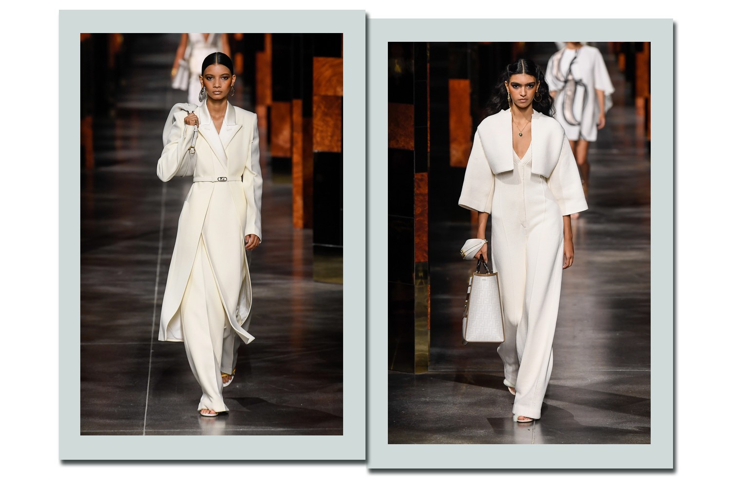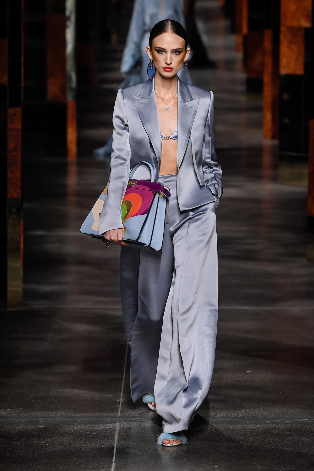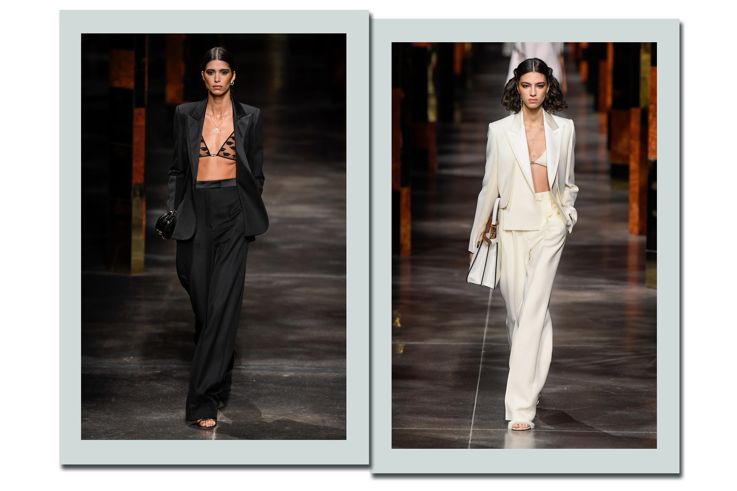 Anota aí: o retorno à vida social é marcado pelos power suits – que na Fendi ganham versões mais leves e brilhantes usados com biquínis.