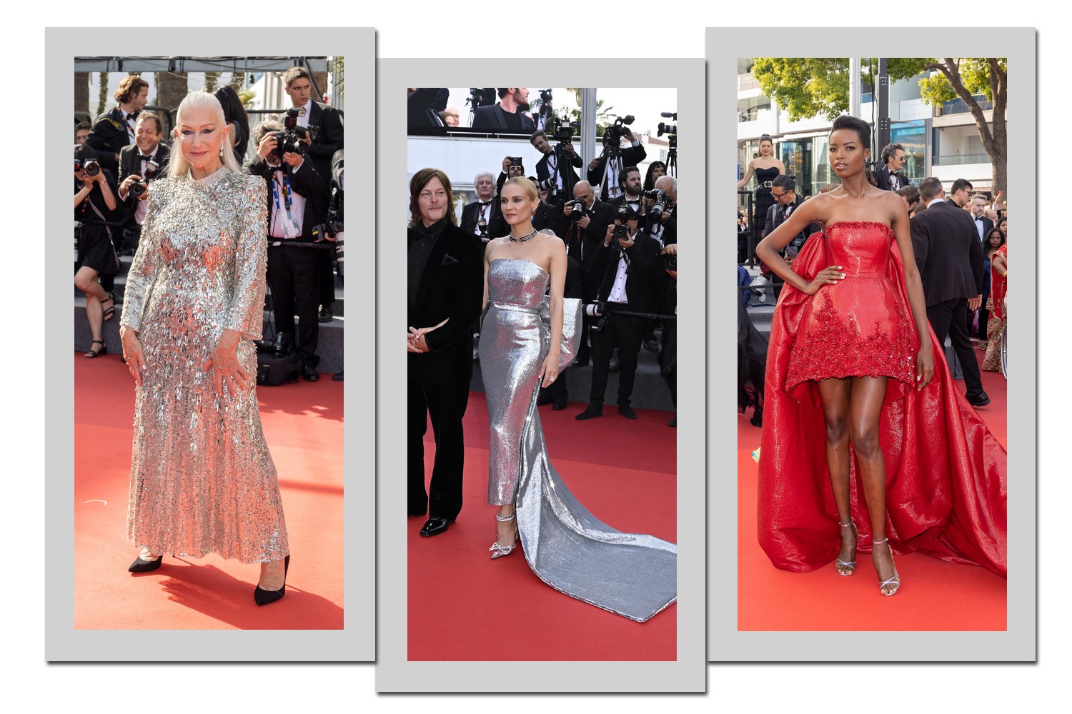 Os materiais brilhantes foram os preferidos das celebridades que compareceram ao evento. O paetê, acabamentos metalizados e tecidos que lembram o glow do vinil foram algumas das técnicas usadas pelas estrelas. Nos últimos dias do festival, Helen Mirren (de Raven), Diane Kruger (de Ami Paris) e Maria Borges (de Ashi Studio) foram algumas convidadas que apostaram nos vestidos com brilho.