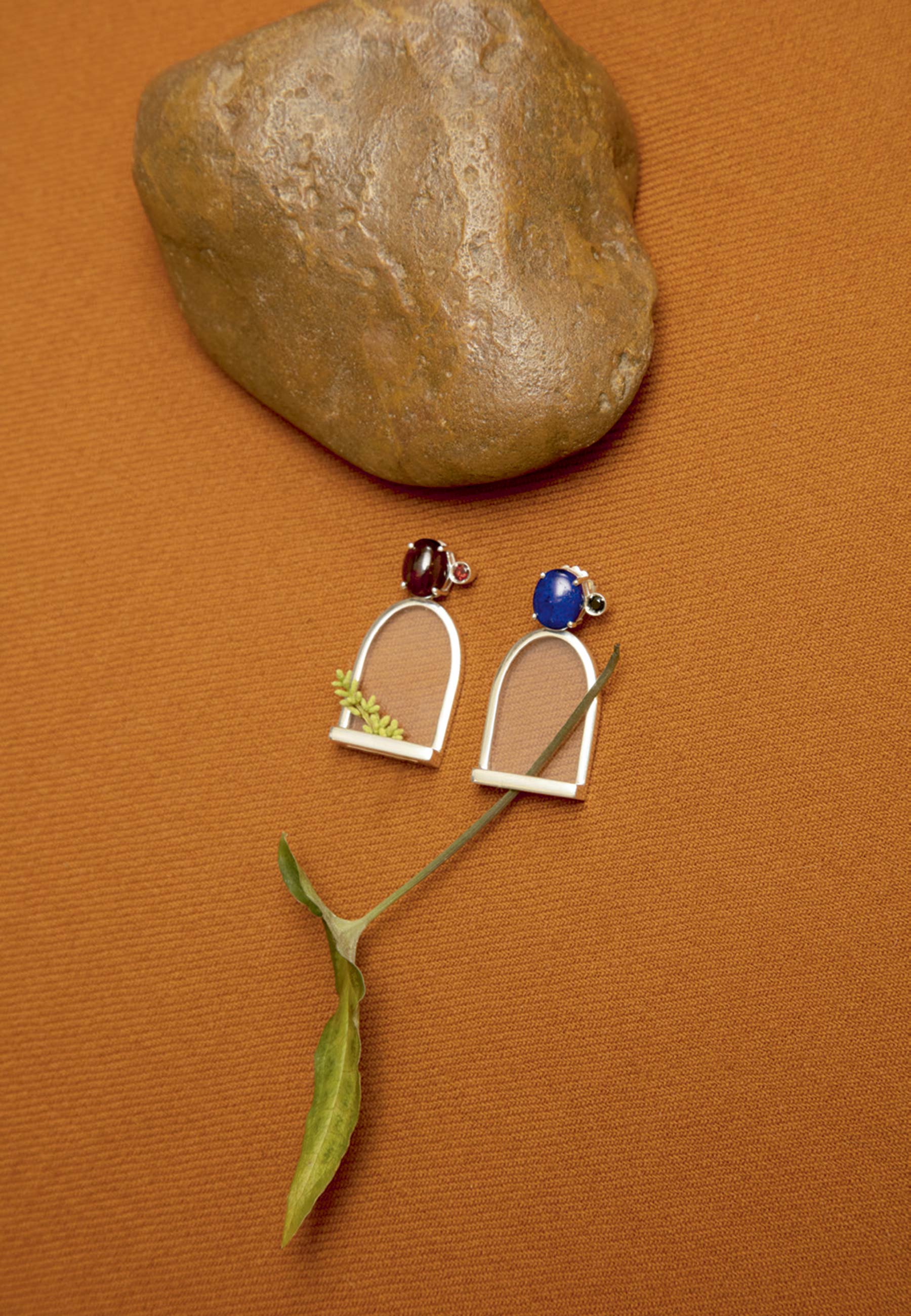 Flavia conta que começou a coleção no final de 2017 e que investiu seis meses de trabalho apenas no recurso que permite o movimento das lâminas, sobrepostas a uma janelinha retangular com vidros de cristal. O segundo modelo, a “Jardineira”, tem charme retrô e permite inserir outros elementos, de pingentes a flores e folhas.