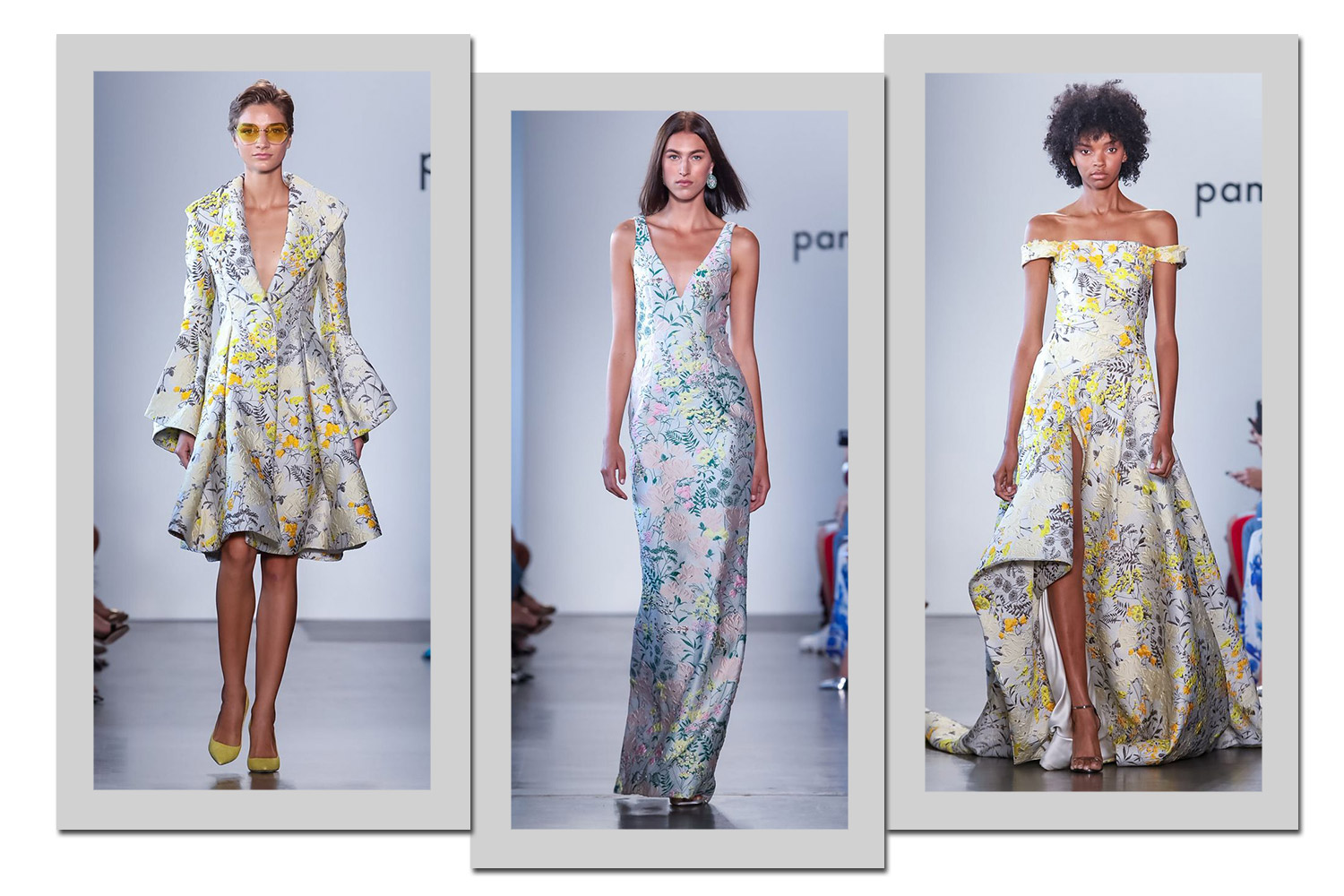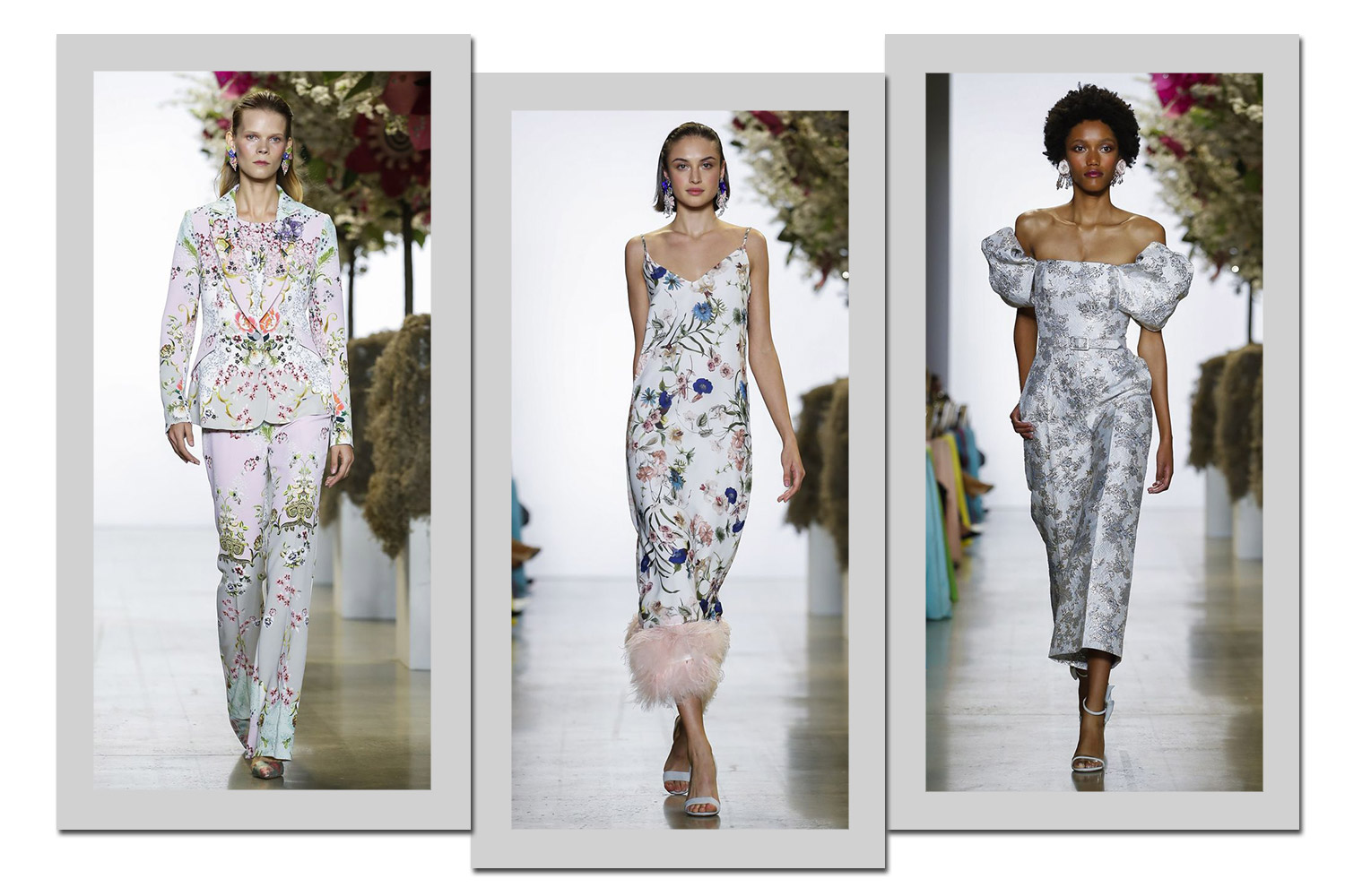 Badgley Mischka aposta no floral em diferentes versões. Primeiro a miudinha pontuada por arabescos, como no terno à esquerda. Para o vestido, flores maiores com caule (ao centro) e, para o macacão cinza, uma versão prateada em alto-relevo.