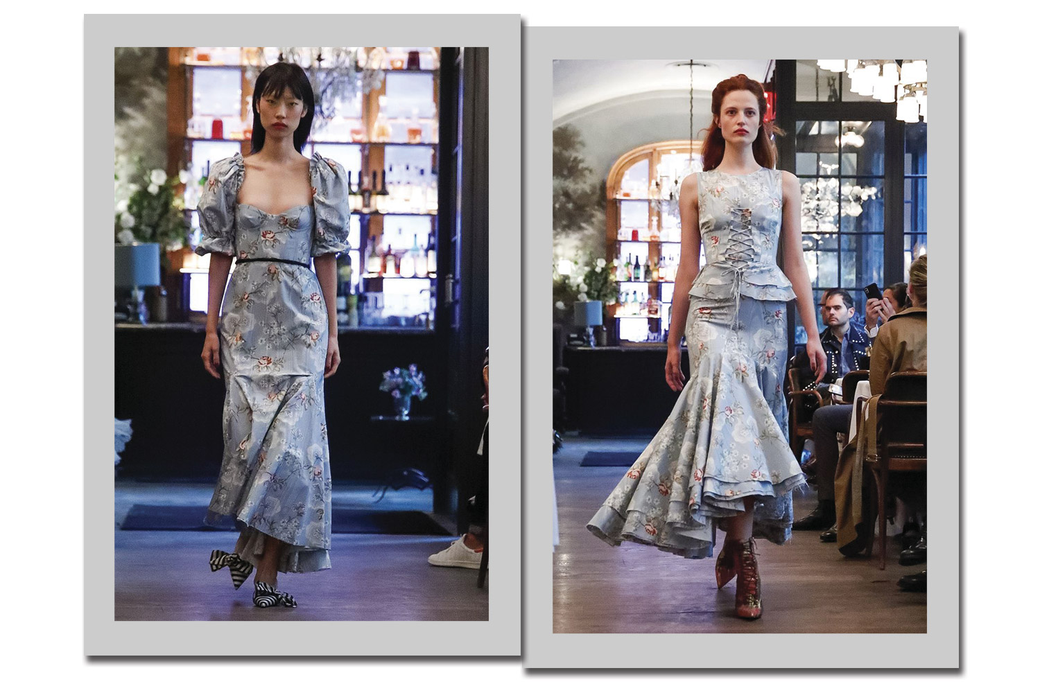 A Brock Collection faz vestidos dignos de uma country girl, com direto a mangas bufantes, babados e silhueta com bojo. O floral em tons pastel fica romântico no tecido de fundo azul.