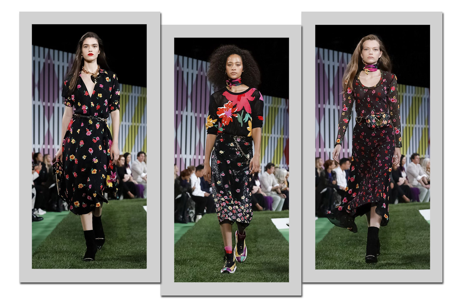 Os florais da grife alemã Escada vêm sempre em fundo preto no verão 2019. As flores podem ser miúdas ou em tamanho máxi, como no tricô do look ao centro, acima.