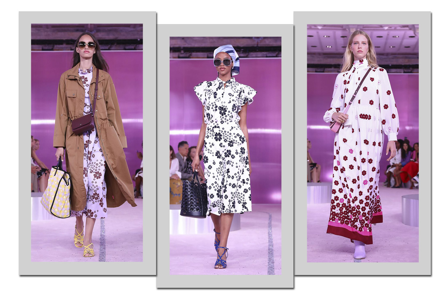 Quem também fez um floral discreto foi a Kate Spade. Flores com ares retrô em fundos claros ganharam um macacão e dois vestidos da label para a estação do calor.