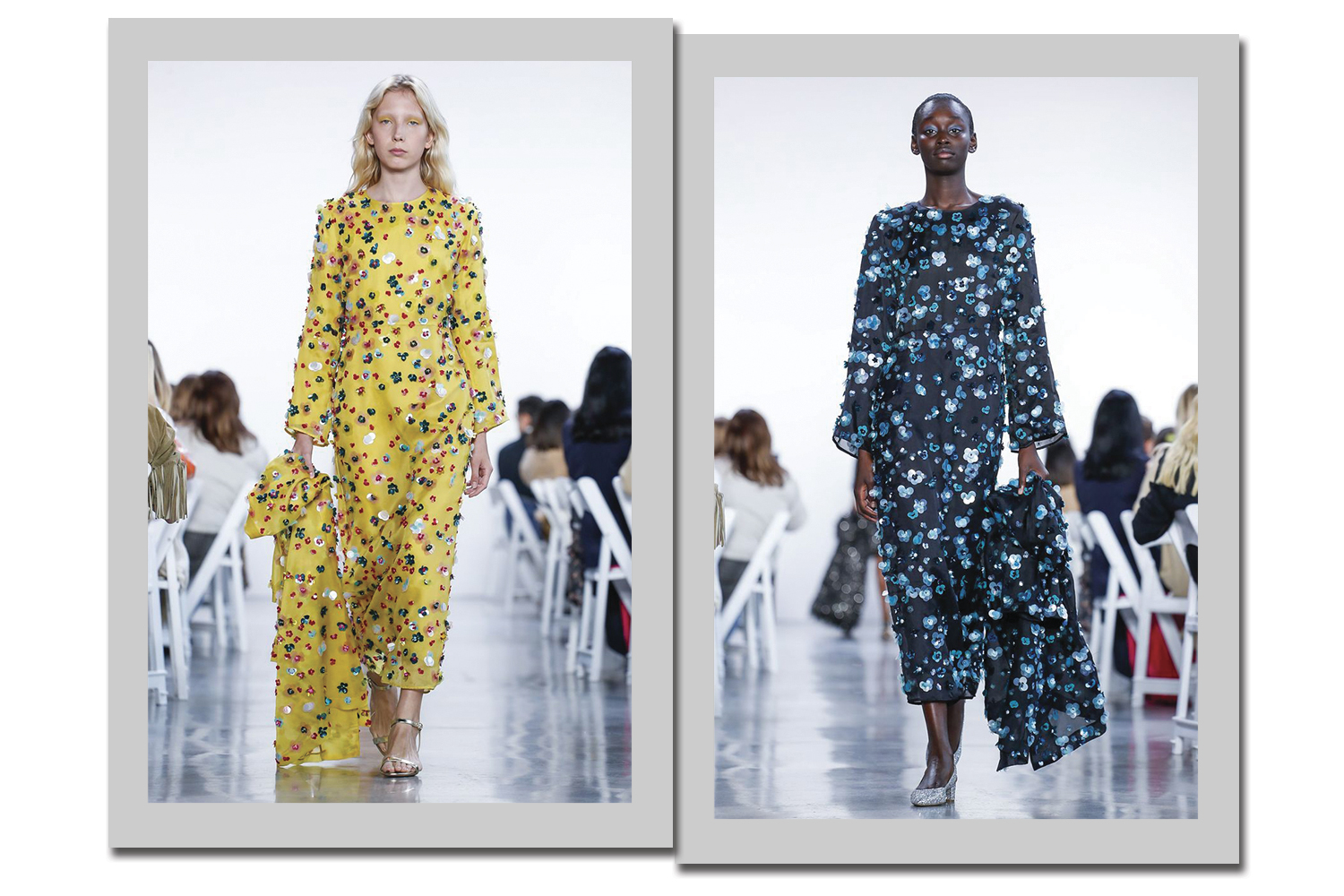 Já a Mansur Gavriel apostou no floral 3D em dois vestidos: o amarelo com bordados coloridos (àesquerda), e o azul marinho com flores azuis claras e brancas (à direita).