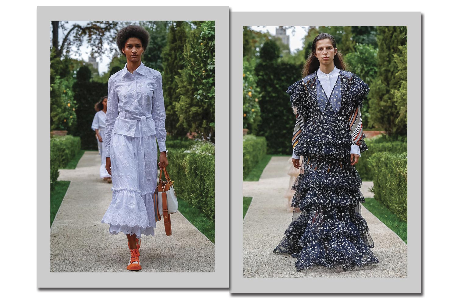 Tory Burch investe em dois caminhos: o floral apenas como alto-relevo (à esquerda) ou o bem miudinho, branco e no fundo preto transparente (à direita).