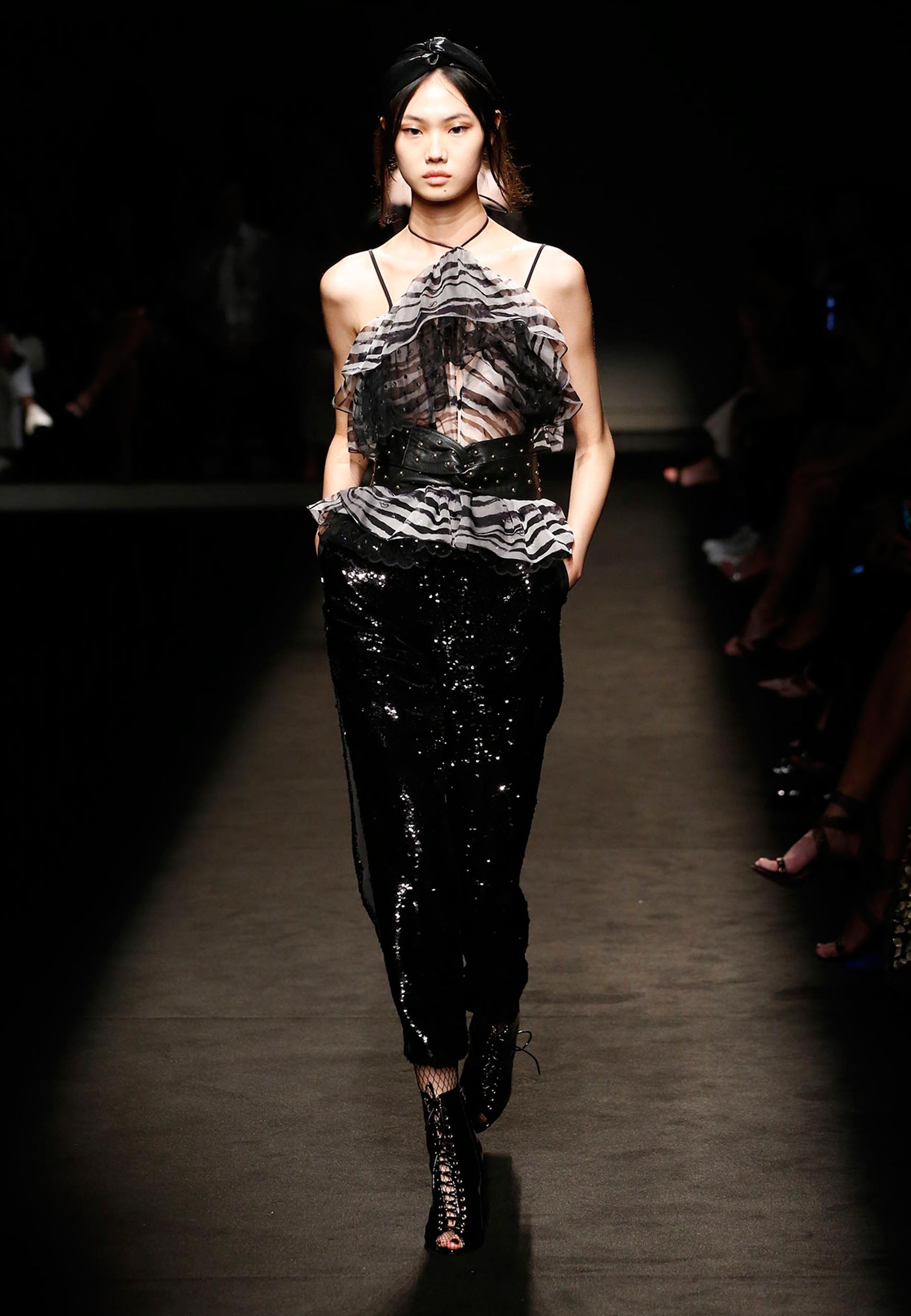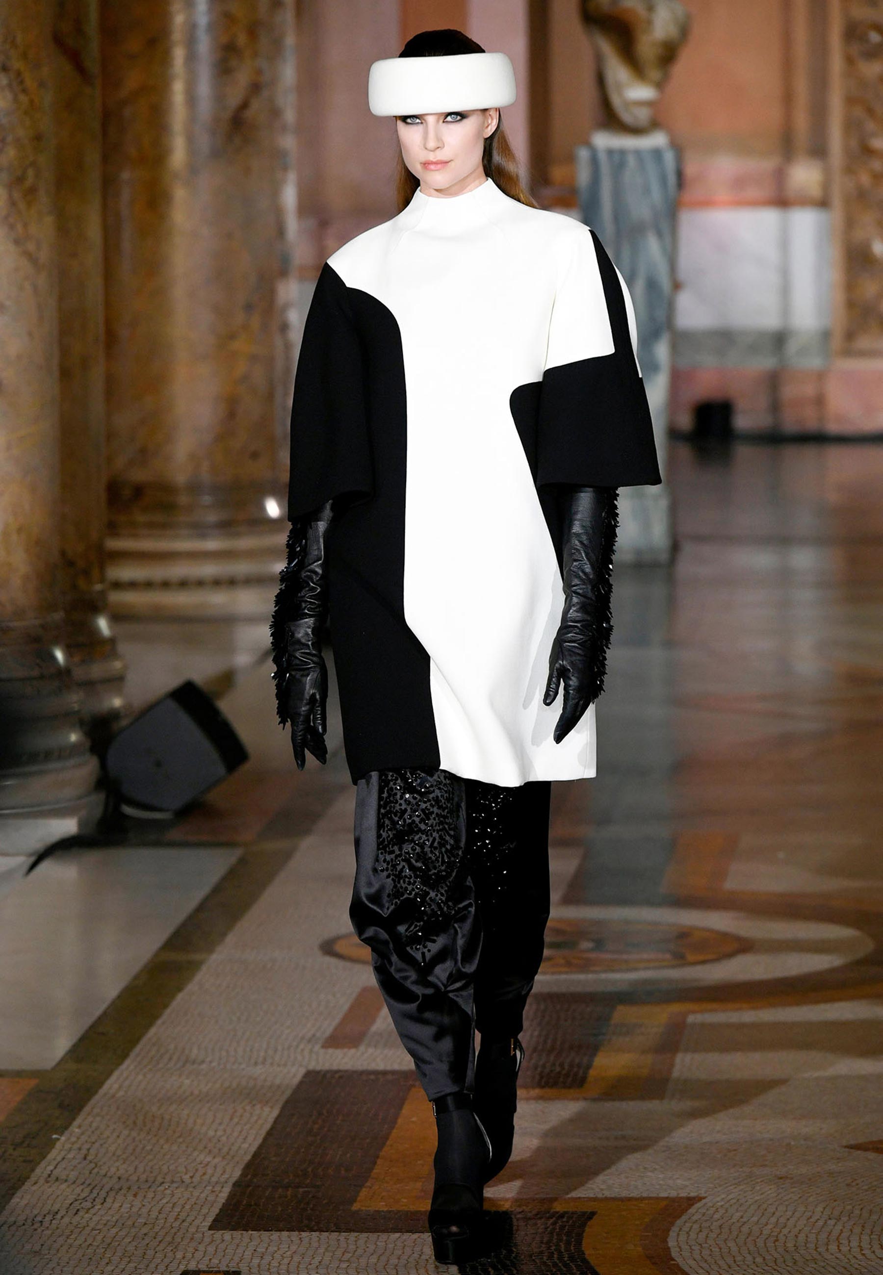 O ar chique de Stephane Rolland segue com faixas das duas cores no mesmo look.