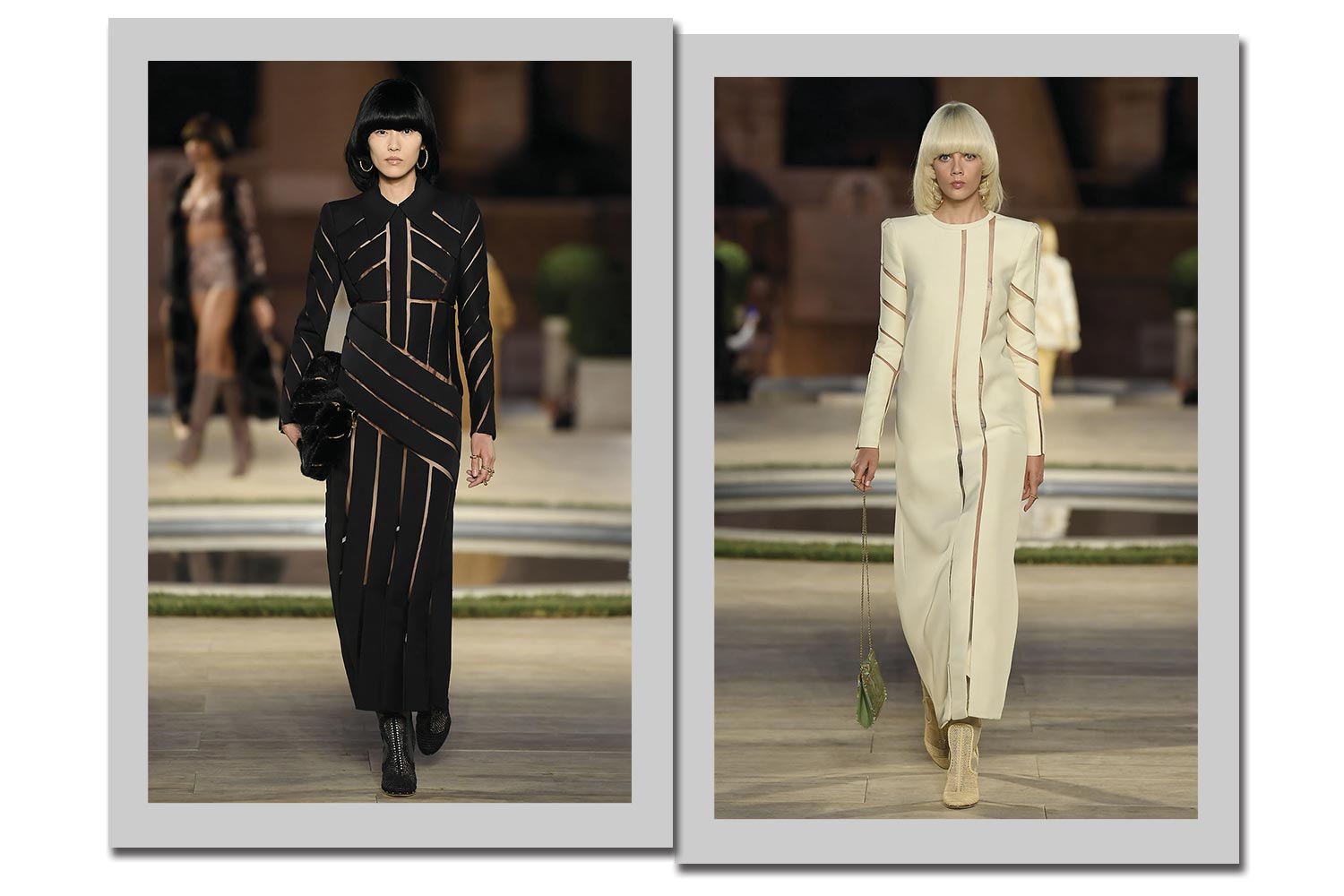 A Fendi brinca com o duo P&B em dois vestidos muito parecidos, marcados pelos recortes que deixam um pouco de pele à mostra.