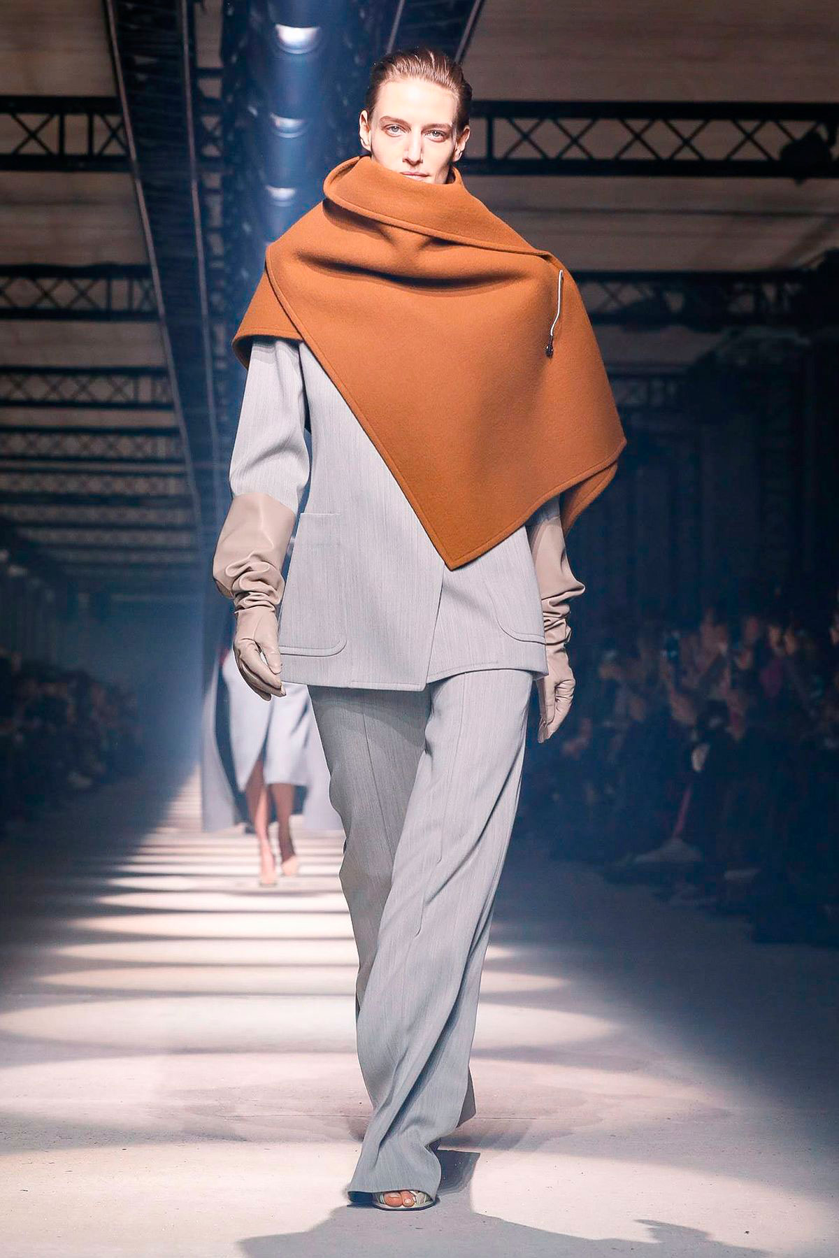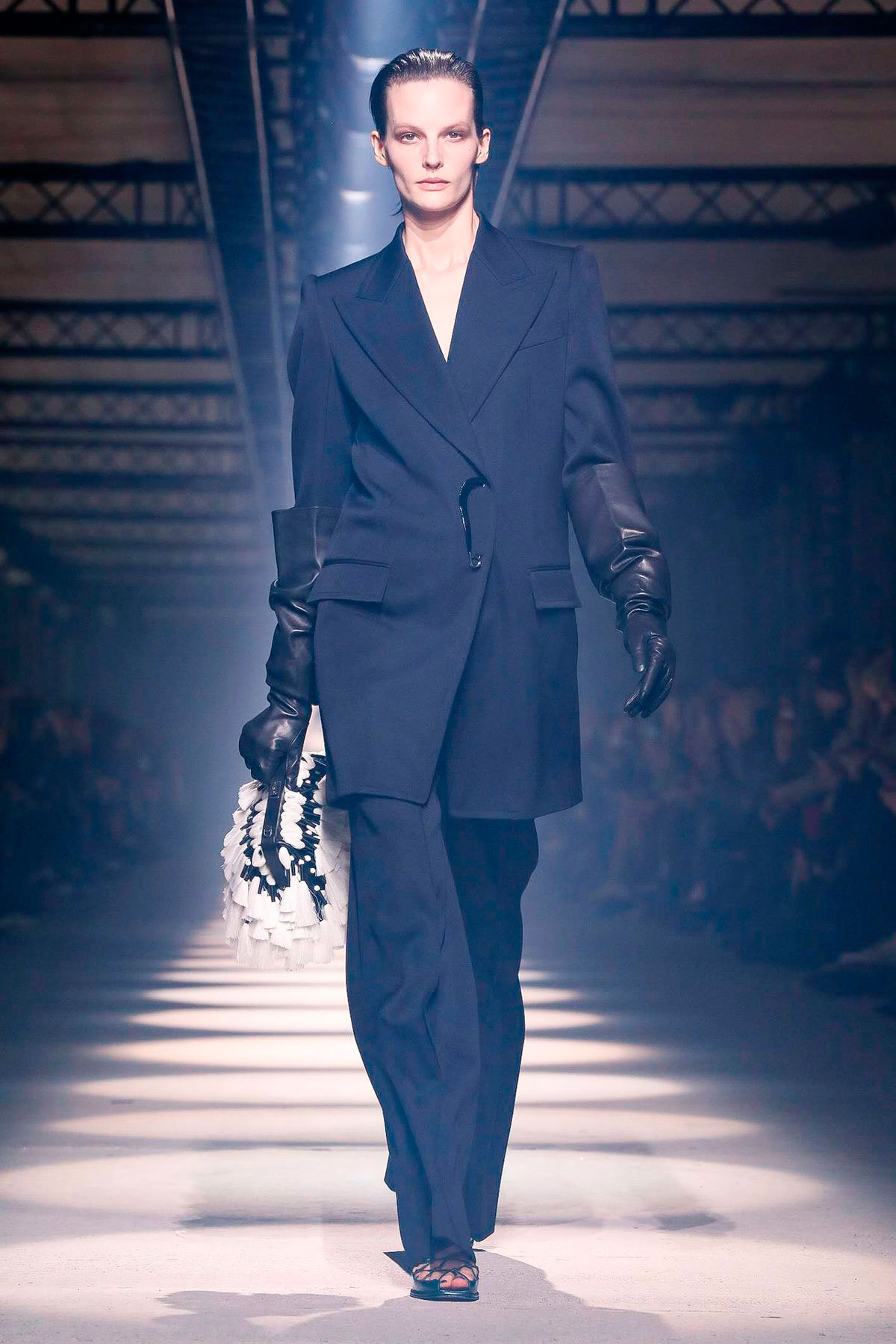 A alfaiataria de amplas proporções ganha styling certeiro. Luvas sobre mangas, bolsas, lenços e maxipastas, além de colares pêndulos, evidenciaram referências burguesas das décadas. Apesar da rigidez dos looks, franjas e plumas suavizaram o visual. Trouxeram leveza para esta poderosa mulher.