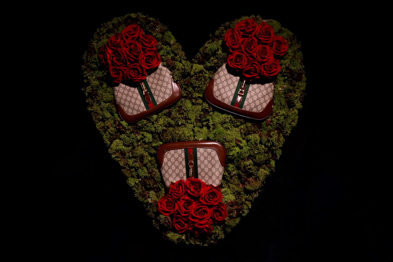 Musgos verdes e rosas vermelhas formam uma bela e romântica instalação em formato de coração, com a icônica bolsa Jackie 1961. A it-bag ganha este nome em referência ao ano em que foi criada. Na releitura do Diretor Criativo Alessandro Michele, apresentada no desfile Fall Winter 2020, ela ganha uma pegada não binária, com seu formato elegante e curvo, com fecho dourado em formato de pistão.