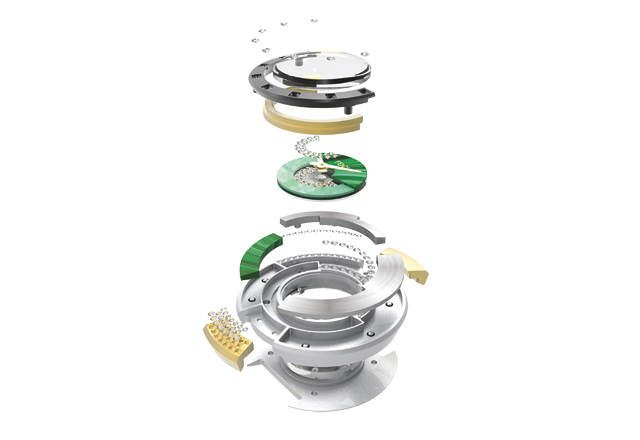 Adoro o efeito 3D, o formato arrojado, com o mostrador diferenciado composto de diversas camadas. Isso cria um formato verdadeiramente único! E, depois, tem o mix de materiais: malaquita, lápis-lazúli, sílex e outras pedras preciosas reunidas com madrepérola, ouro e diamantes, dando vida a um perfeito mosaico moderno, natural e tecnológico.