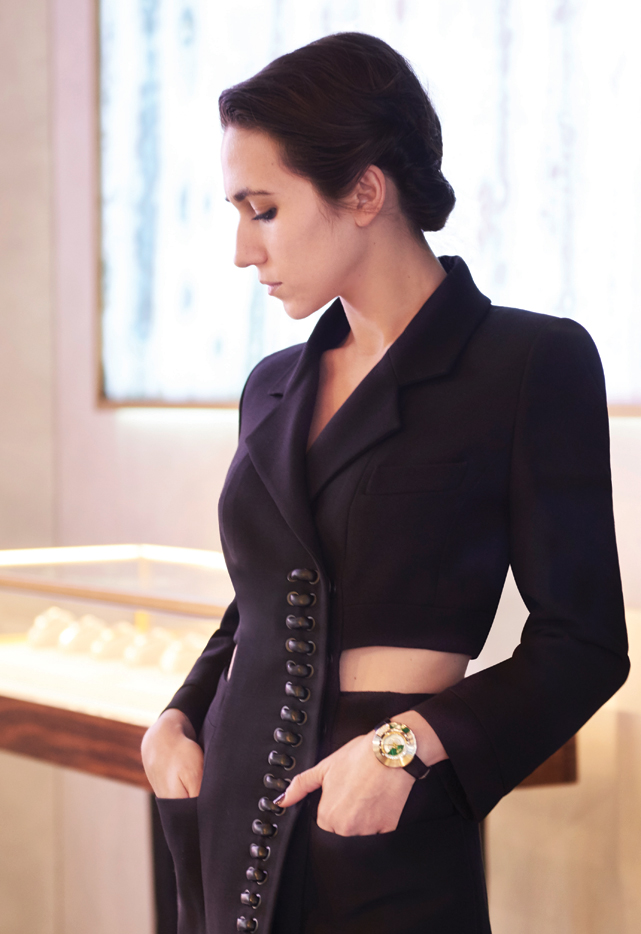 Adoro o efeito 3D, o formato arrojado, com o mostrador diferenciado composto de diversas camadas. Isso cria um formato verdadeiramente único! E, depois, tem o mix de materiais: malaquita, lápis-lazúli, sílex e outras pedras preciosas reunidas com madrepérola, ouro e diamantes, dando vida a um perfeito mosaico moderno, natural e tecnológico.