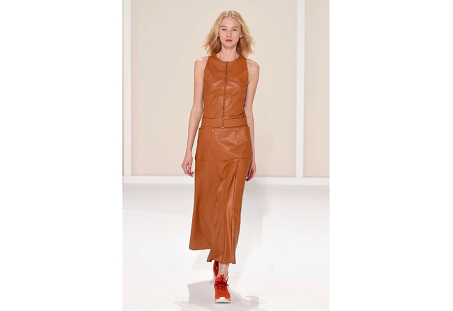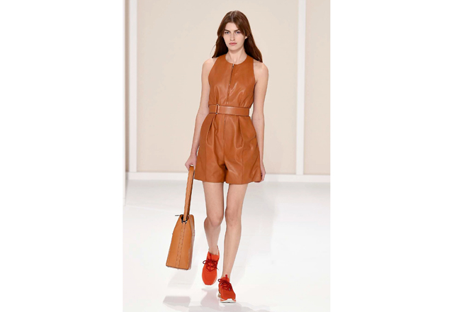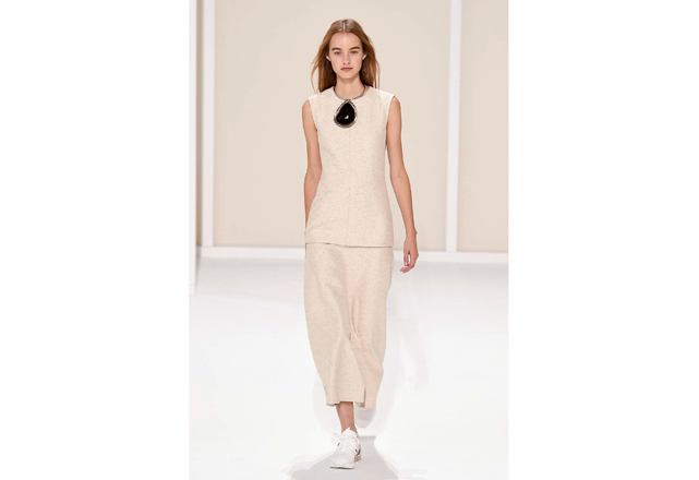 Agora, com a mesma silhueta alongada e cartela de cores neutras, trabalha com uma maior despretensão em conjuntos de camisas com calças amplas, vestidos de couro superfino com saia plissada e ótimos peças derivadas dos famosos carrés da maison. Ah, e tudo arrematado por um já muito desejável tênis, toque esportivo e utilitário, mais do que bem-vindo para essa meca do luxo discreto.
