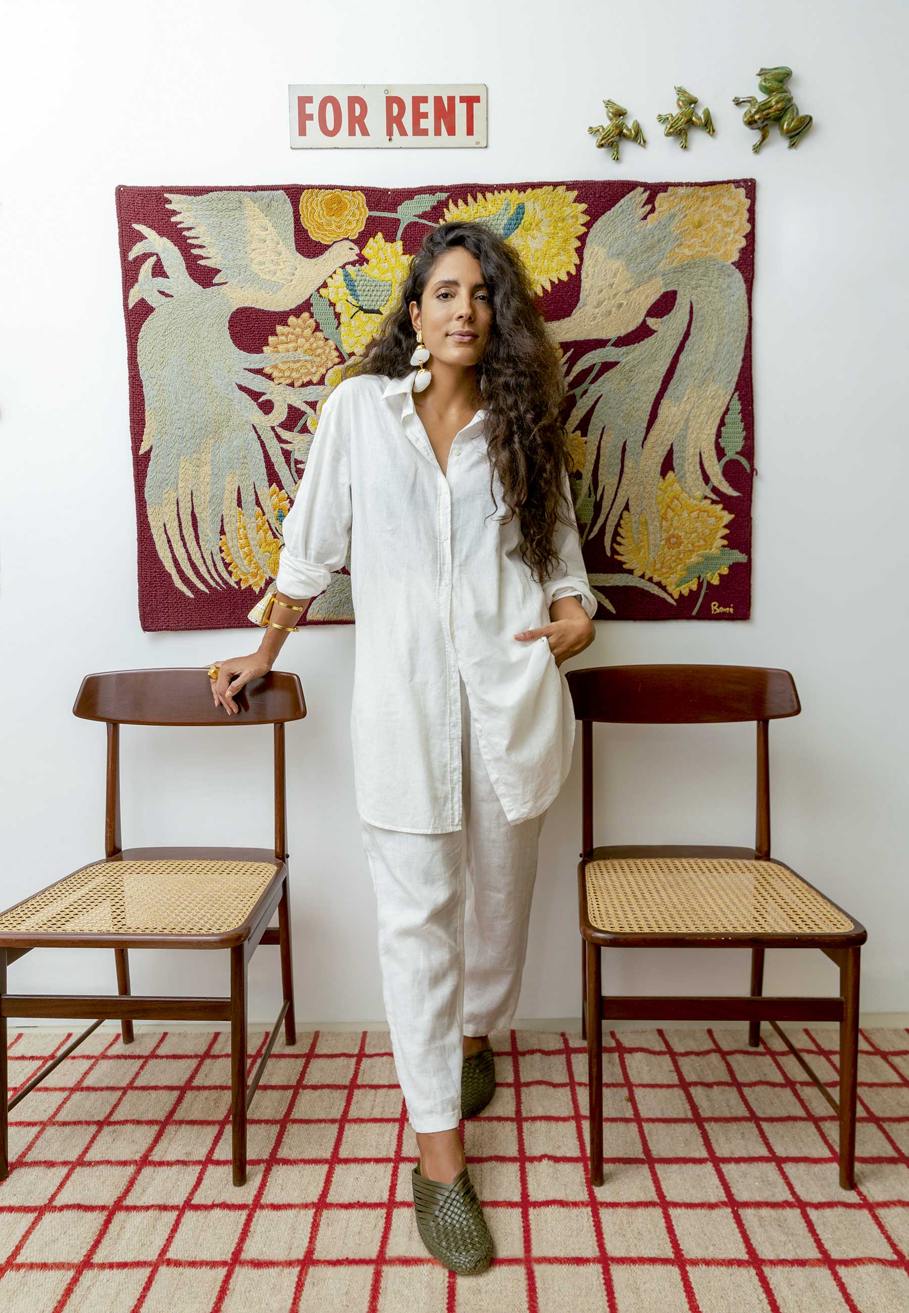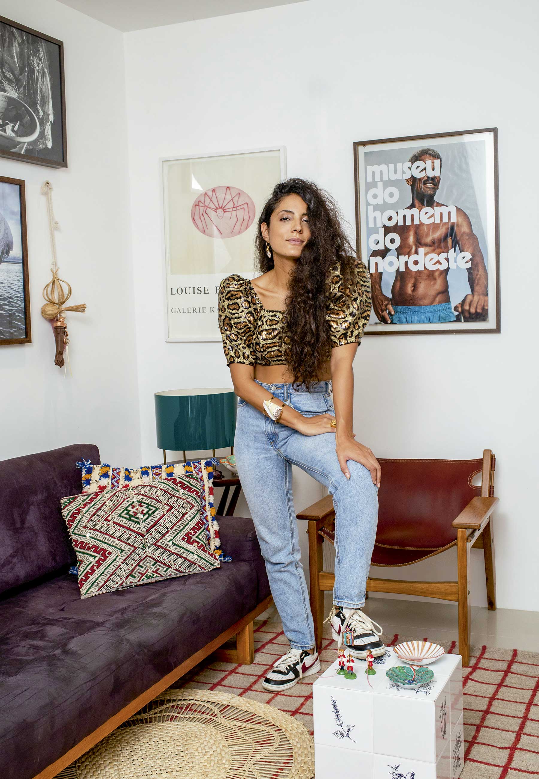 Julia usa look de linho comprado na Grécia, babouche Cris Barros e acessórios de sua marca. Ao fundo, tapeçaria vintage e cadeiras Sergio Rodrigues – Foto: Lucas Bori