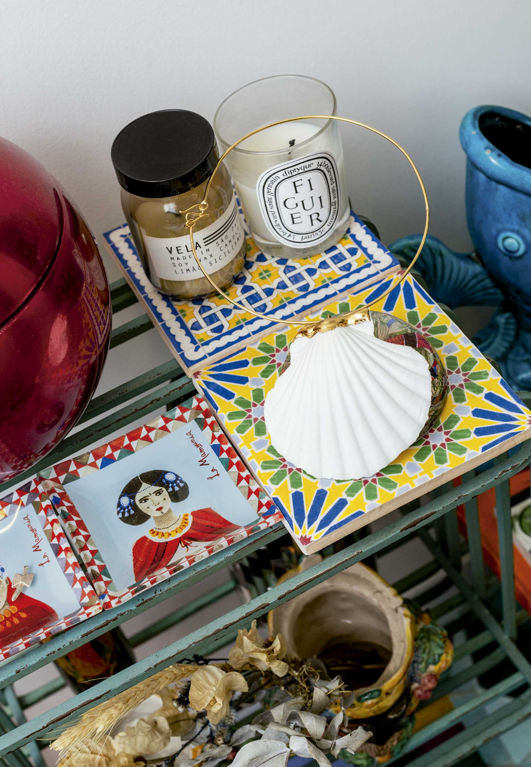 Bonés e pochete de sua marca homônima, vaso e objetos comprados na Bahia e mesa de Adriana Varejão – Foto: Lucas Bori