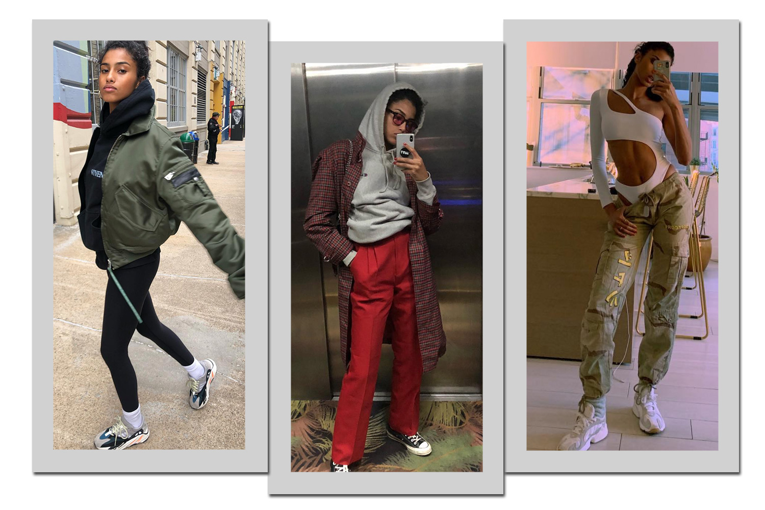 O athleisure está enraizado nos looks de Imaan. O tênis é seu acessório preferido, enquanto peças de moleton se misturam com as de alfaiataria e formam um visual incrível. Ela ainda prova que o mood esportivo também é sexy: combinar a calça cargo com o body off white é a pedida.