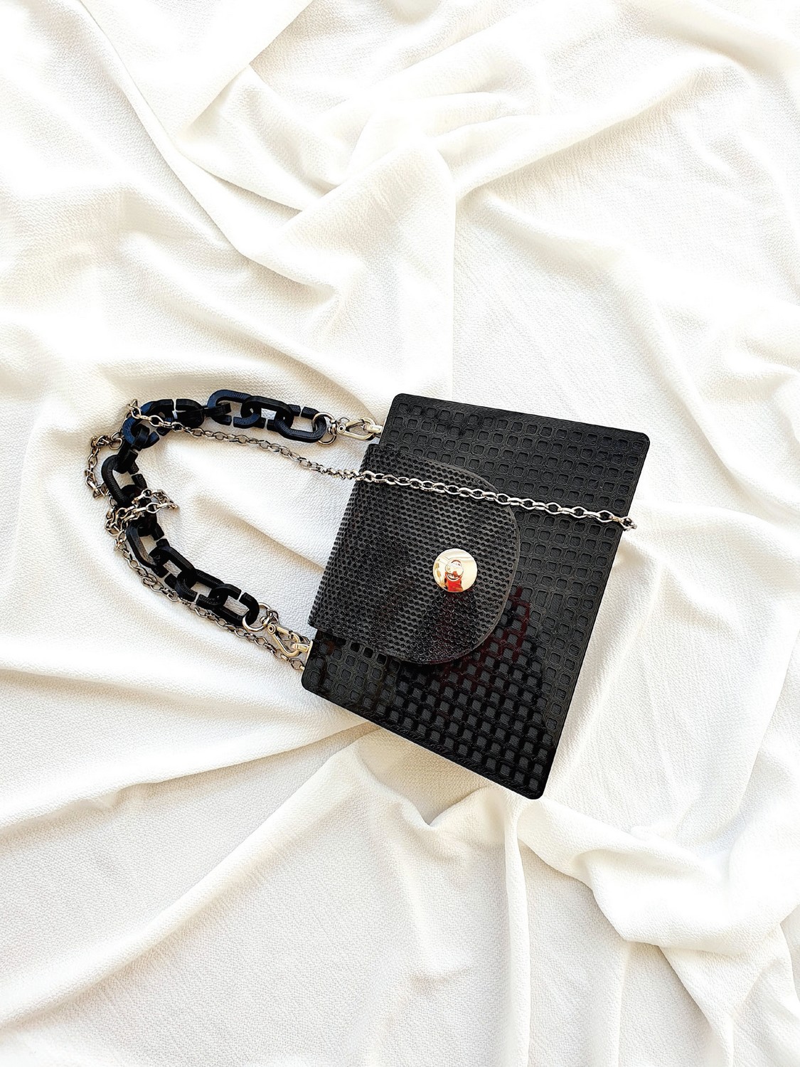 O modelo pequeno da bolsa é daqueles que surpreende: cabe tudo. A designer Raquel Souza também faz colares, porta-celular com alça, tornozeleira e até máscara com filtro. Tudo com a ajuda da tecnologia de impressão 3D. Dá para comprar na loja, em Floripa, ou pelo e-commerce.