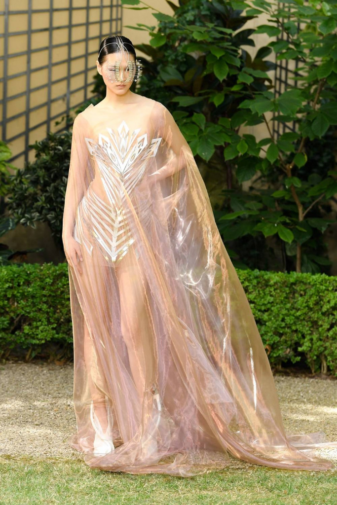 Para esta linha, a marca aposta em formas geométricas que, sobre o tule ou adicionadas a hastes de fibra de vidro, parecem voar ao redor do corpo das modelos. As inspirações do fundo do mar dão uma leveza que contrapõem a exatidão das formas retas.
