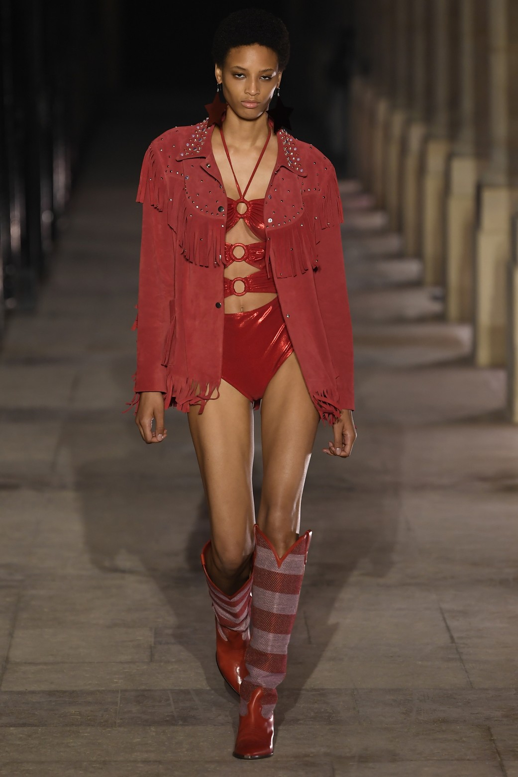 Entre os looks apresentados, nosso preferido é o maiô vermelho de lamê usado com a jaqueta com franjas de camurça – um mood disco western.