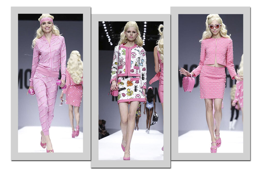 2. Em 2015 foi a vez da Barbie servir de tema para a coleção ready to wear de verão. O rosa e o penteado loiro clássico da boneca marcaram presença na passarela. Pérolas e estampa com roupas de bonecas de papel fizeram parte da construção da coleção. As Barbies temáticas também apareceram na passarela, como a Barbie academia, lançada nos anos 1980.