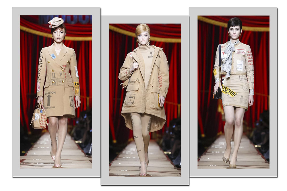 4. Caixas foram a inspiração do outono/inverno 2017. Os looks beges imitavam a caixa de papelão, e vinham estampados com os símbolos de “Frágil” e “Este Lado Para Cima”. Os acessórios, como chapéus e bolsas, tinham a modelagem quadrada e amassada. O debrum das peças pareciam durex, em bege brilhante. Jeremy Scott fez a silhueta remeter à forma quadrada.