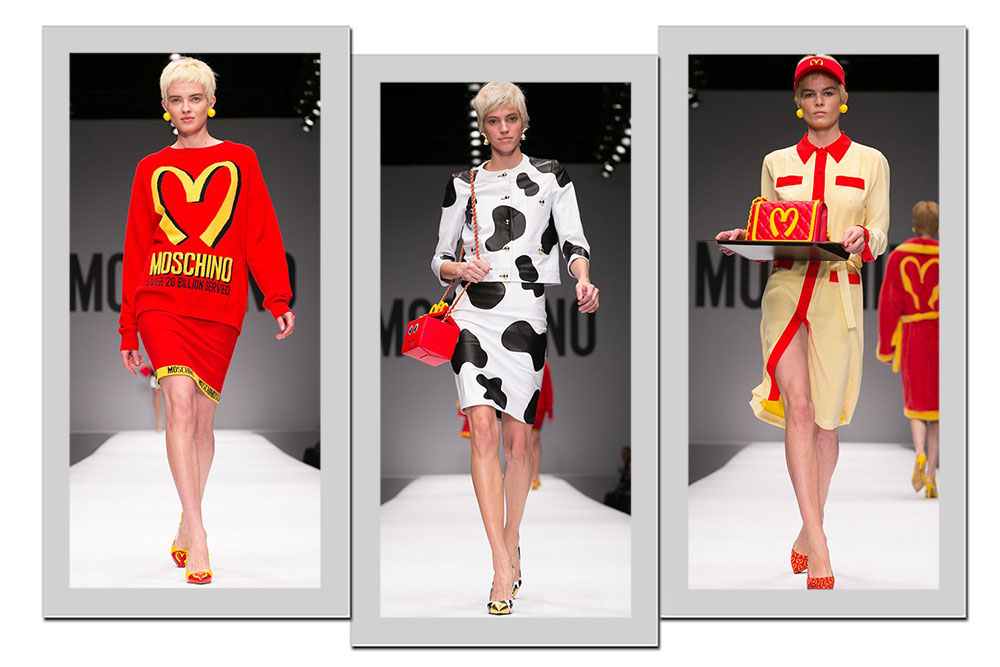1. No desfile inverno 2014, Jeremy Scott usou p McDonald’s como inspiração. A rede de fast food americana serviu também para promover a mudança do logo da label italiana. O “M” de Moschino ganhou uma releitura orgânica, baseada nas letras do restaurante. O amarelo e o vermelho foram escolhidos como cores principais da cartela, e a estampa de pele de vaca também apareceu como motivo nas peças do designer americano. Bolsas desenvolvidas como as caixas do “McLanche Feliz” se tornaram as it bags da temporada.