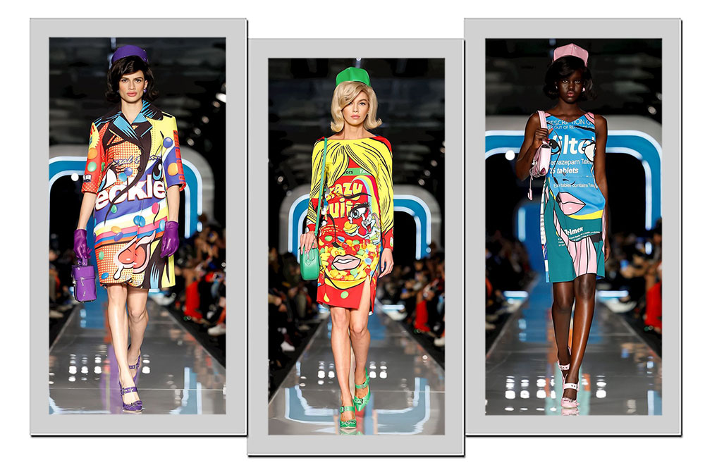 3. Aproveitando a vibe boneca, o estilista americano criou as peças da coleção verão 2017 como as roupas das bonecas de papel, brinquedos típicos dos anos 1980. Todos os looks têm os recortes de papel retangulares ao redor da roupa, dando a impressão que seria necessário dobrar o detalhe para segurar a roupa no lugar. Para o logo, Jeremy Scott apostou em dois pontos de interrogação opostos e sobrepostos, se referindo ao logo da Chanel. O urso presente nos looks usa uma t-shirt branca, que diz “Este não é um brinquedo Moschino”. O acessório virou hit como capinha de celular.