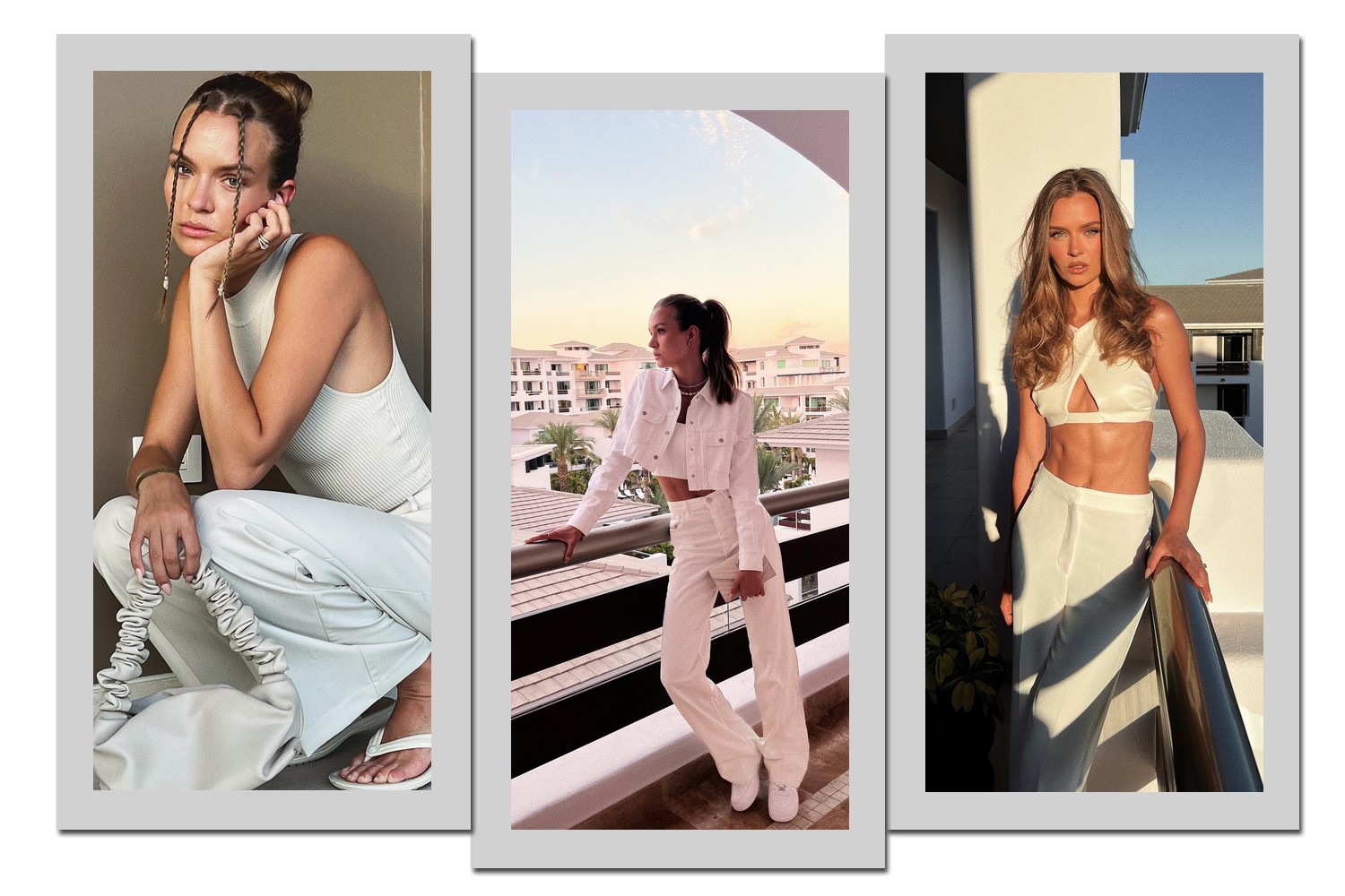 Principalmente nos dias que antecederam seu casamento, a modelo se jogou nos looks all white. Para deixar os visuais claros mais interessantes, Josephine gosta de acrescentar acessórios chamativos, como as bolsas e o chinelo, peças com recortes e – um item essencial em seu guarda-roupa – jaquetas.